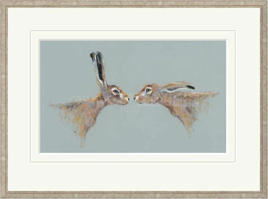 Brief Encounter by animal artist Nicky Litchfield captures two hares tentatively leaning together to almost touch noses on a blue grey background. Nicky Litchfield is a talented British artist creating works of art using animals as her subject matter. Her work is characterised by coloured backgrounds with the animal often placed off centre which adds to the character and personality of the art.