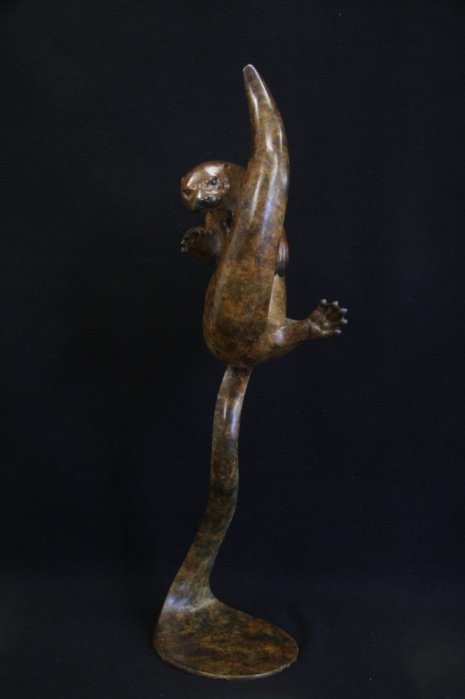 Churn Otter is a sculpture by famed sculptor, Adam Binder, and captures the playful movement and effortless grace of the otter in water, fixed to a contemporary curved stand. This textural sculpture adopts lifelike features of the Otter. Adam works primarily in bronze with the use of rich, earthy patinas which provides depth and texture, drawing from his experiences of nature he captures the characteristics of animals and nature to engage the eye in the detail of his works.