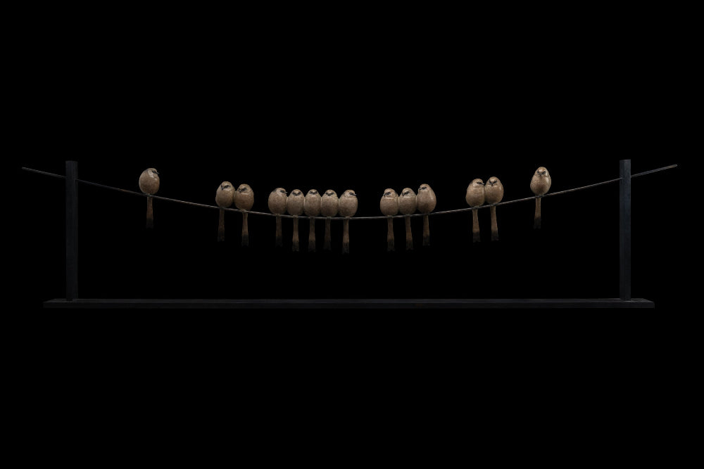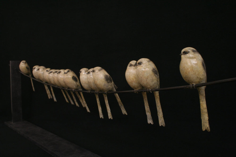 Fourteen Long Tailed Tits is a sculpture by famed sculptor, Adam Binder, and depicts 14 Tits perched on a fine long wire with soft and reflective tones of bronze, this textural sculpture adopts lifelike features of the birds. Adam works primarily in bronze with the use of rich, earthy patinas which provides depth and texture, drawing from his experiences of nature he captures the characteristics of animals and nature to engage the eye in the detail of his works.