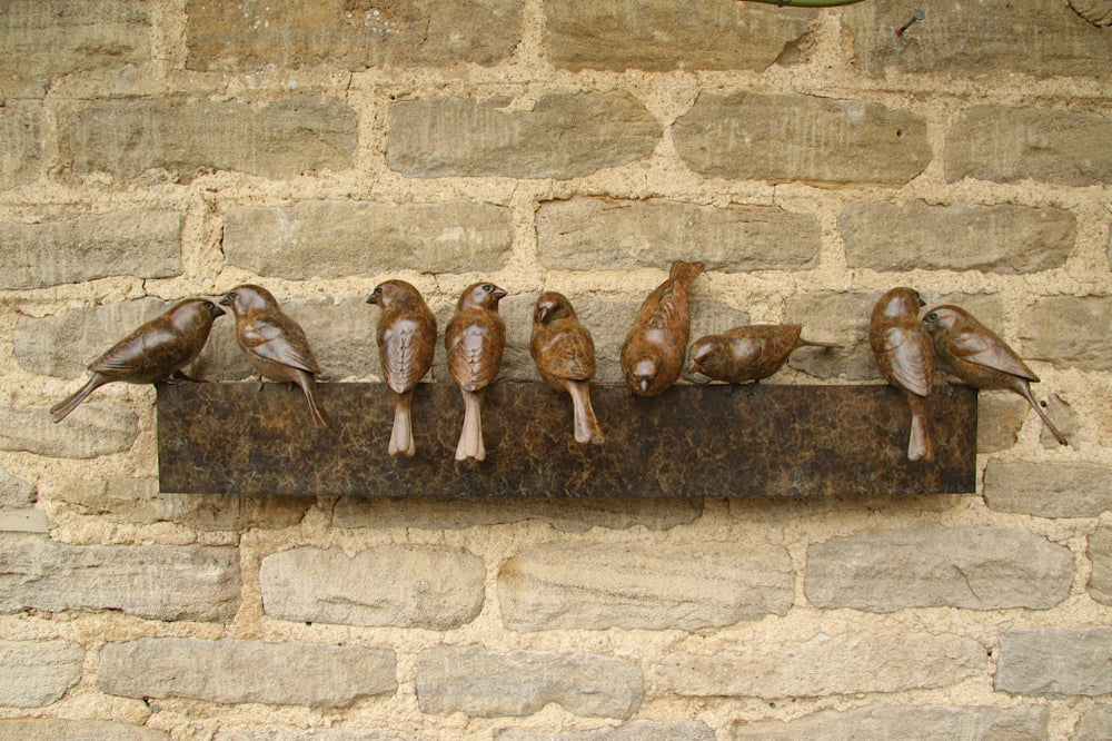Nine Sparrows II is a wall sculpture by famed sculptor, Adam Binder, and depicts Nine Sparrows perched on a elongated sculptural form. With rich colours of brown this textural sculpture adopts lifelike features of the Sparrows. Adam works primarily in bronze with the use of rich, earthy patinas which provides depth and texture, drawing from his experiences of nature he captures the characteristics of animals and nature to engage the eye in the detail of his works.