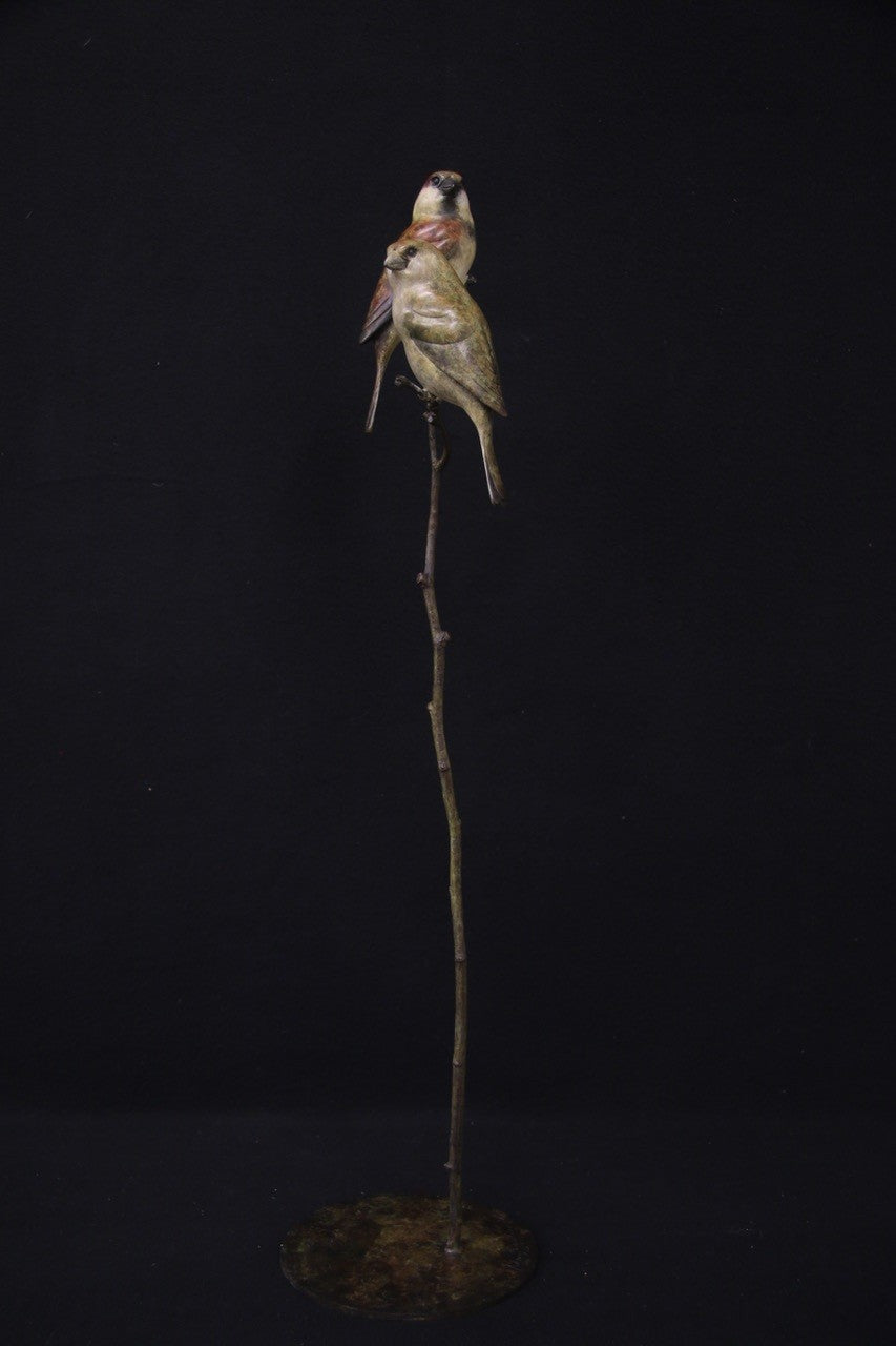 Pair of Sparrows is a sculpture by famed sculptor, Adam Binder, and depicts a pair of Sparrows sitting close together on a slender branch, this textural sculpture adopts lifelike features of the Sparrows. Adam works primarily in bronze with the use of rich, earthy patinas which provides depth and texture, drawing from his experiences of nature he captures the characteristics of animals and nature to engage the eye in the detail of his works.