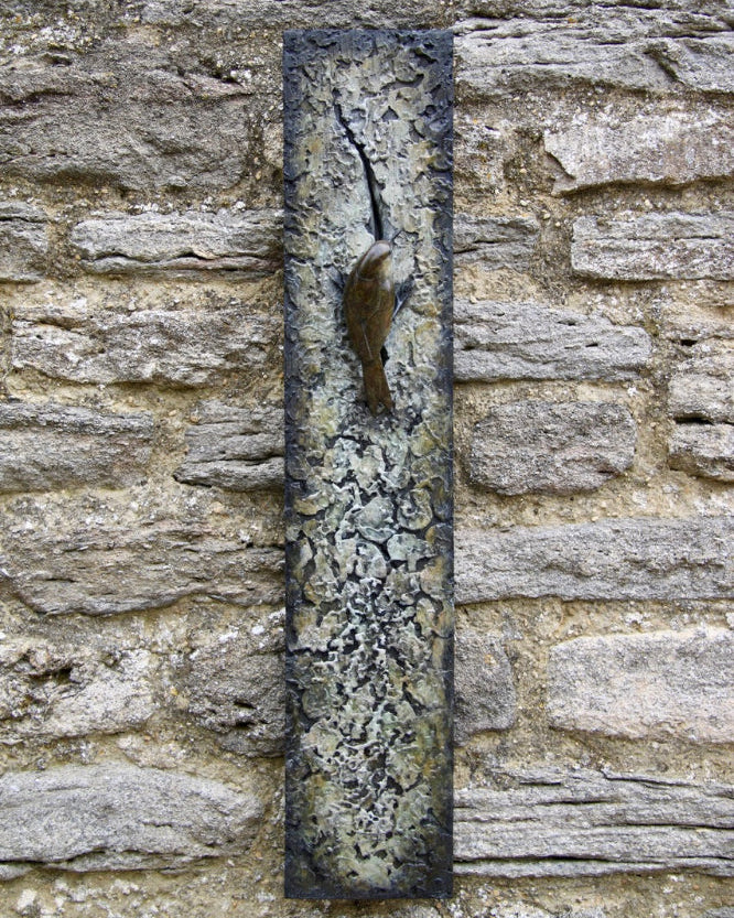 Tree Creeper Plaque is a wall sculpture by famed sculptor, Adam Binder, and depicts a bird perched on the side of a tree trunk. With rich colours of brown this textural sculpture adopts lifelike features of the bird. Adam works primarily in bronze with the use of rich, earthy patinas which provides depth and texture, drawing from his experiences of nature he captures the characteristics of animals and nature to engage the eye in the detail of his works.