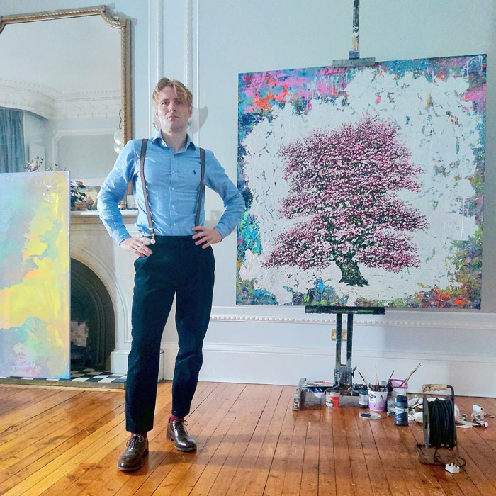 Jack Frame’s tree paintings, created en plein air, capture the harmony and beauty of nature. Influenced by a range of artists and philosophies, his work combines oils, acrylics, and traditional techniques like gilding and marbling for vibrant, textured compositions. Born in 1983 in Kent, Frame’s art has earned international acclaim, attracting collectors such as Kate Hudson and Matt Bellamy. His work is driven by the dynamic interplay of colour, shape, and form.