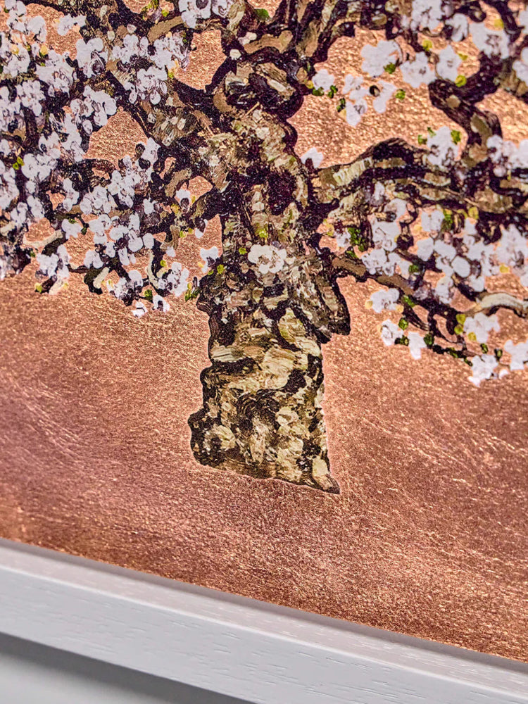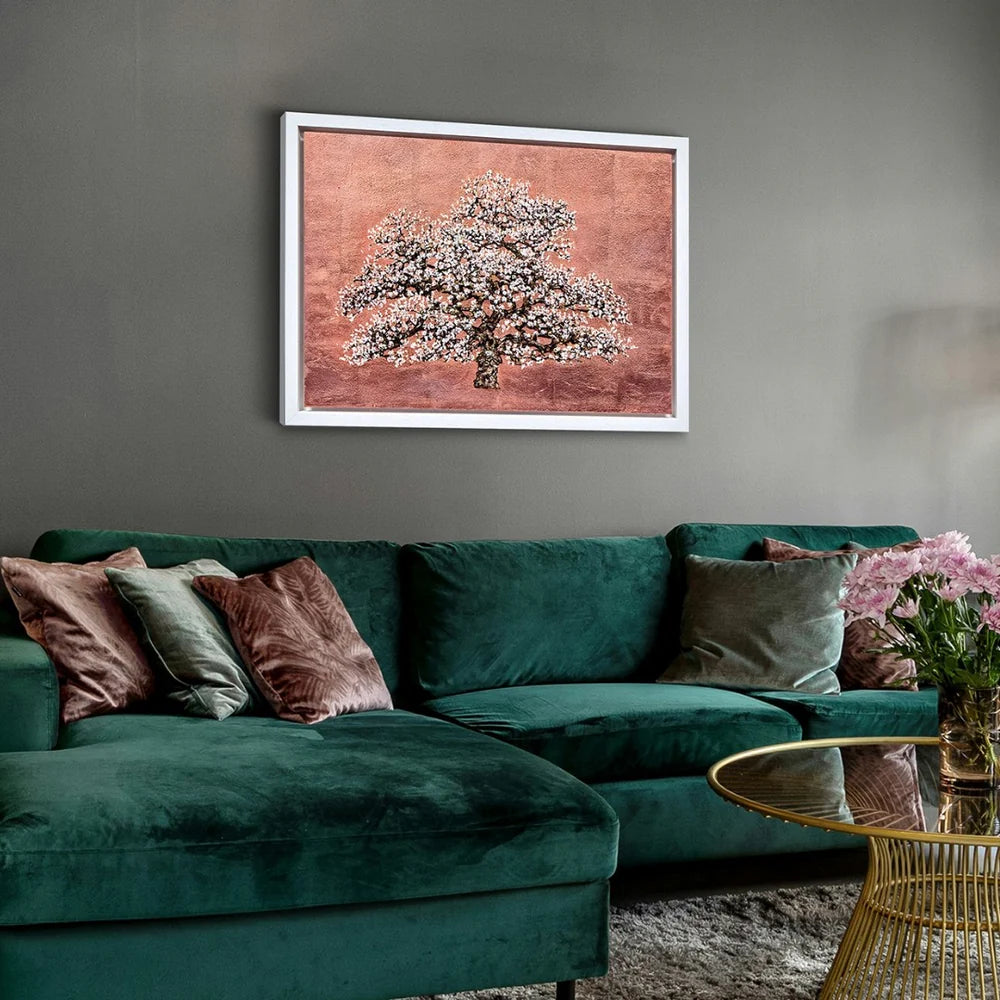Afterglow by British Artist, Jack Frame is set against a shimmering bronze background, this elegant artwork by Frame features a delicate tree adorned with pale pink and white blossoms, illuminating the artwork. Its subtle radiance and intricate texture showcase Frame’s talent for merging natural beauty with minimalist serenity. Uplifting and tranquil, the piece reflects light beautifully, bringing warmth, elegance, and a touch of nature to any space, throughout winter and beyond.