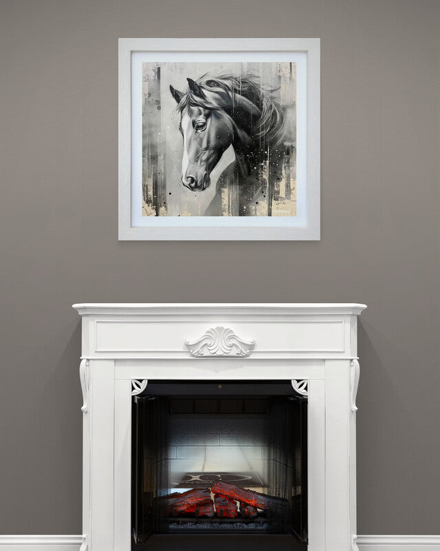 Jeffery’s meticulous attention to anatomical detail is balanced by expressive, painterly textures, delicate splatters, silver leaf and atmospheric shading that give the composition a modern, almost cinematic feel. The horse’s flowing mane, illuminated highlights, and poised downward gaze evoke both elegance and nobility, making this artwork an impressive centrepiece for any interior.