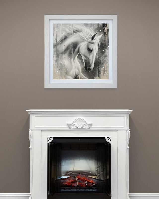 Jeffery’s meticulous attention to anatomical detail is balanced by expressive, painterly textures, delicate splatters, silver leaf and atmospheric shading that give the composition a modern, almost cinematic feel. The horse’s flowing mane, illuminated highlights, and poised downward gaze evoke both elegance and nobility, making this artwork an impressive centrepiece for any interior.