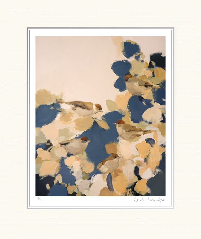Blackcaps in Blue by artist Heidi Langridge is an Signed Giclée Limited Edition Print. Its tranquil subject of female blackcap birds are gently perched amongst a navy blue and caramel canopy of foliage. Known for her charming bird paintings, Heidi Langridge's work is calm and peaceful, her prints bring a sense of serenity to their surroundings and are a fantastic choice of artwork for a peaceful space.