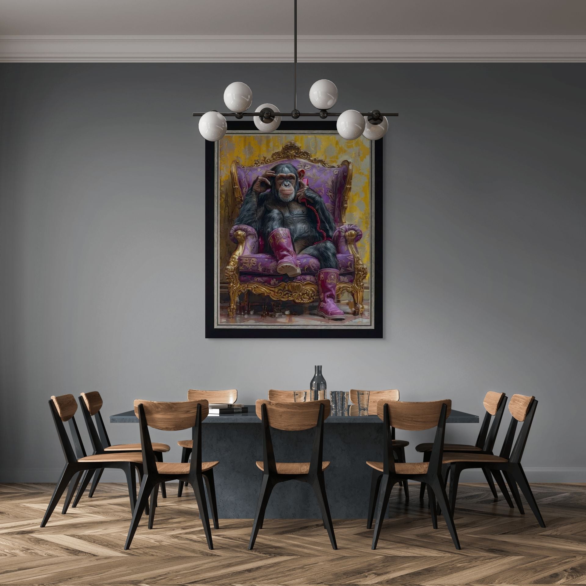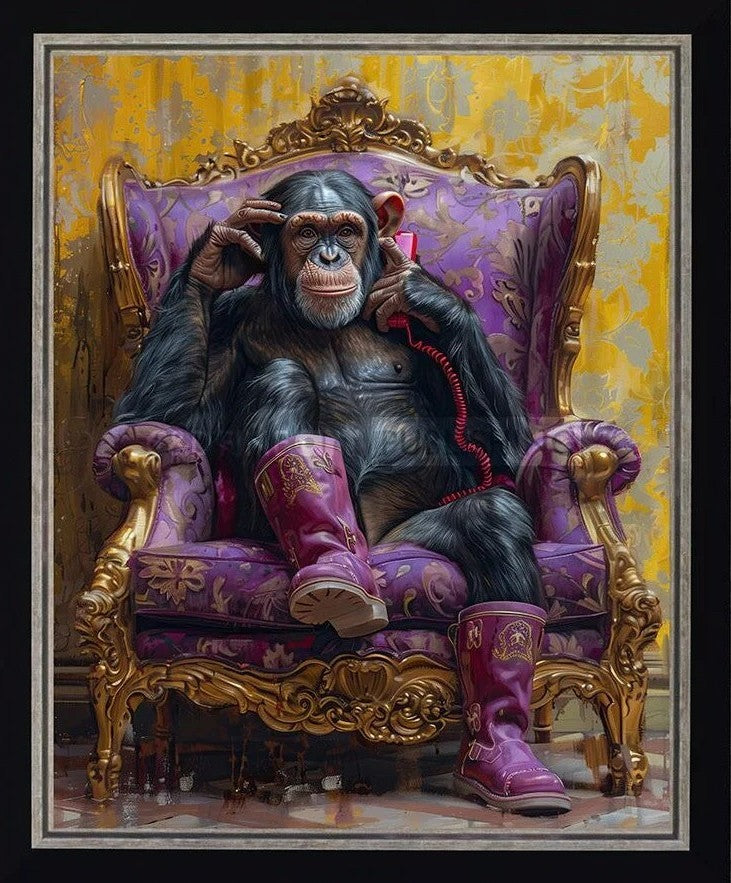 Booty Call by new artist to the Rose Gallery - Boid. Bold, bright & satirical characterises the art created by Boid - bringing a contemporary new edge to animal artwork. Booty call - a chimp astride a gold throne with flamboyant cowboy boots. A true statement piece & sure to provoke a reaction! Booty Call is available both in the smaller standard limited edition, with just 40 copies of the larger Artist Proof.