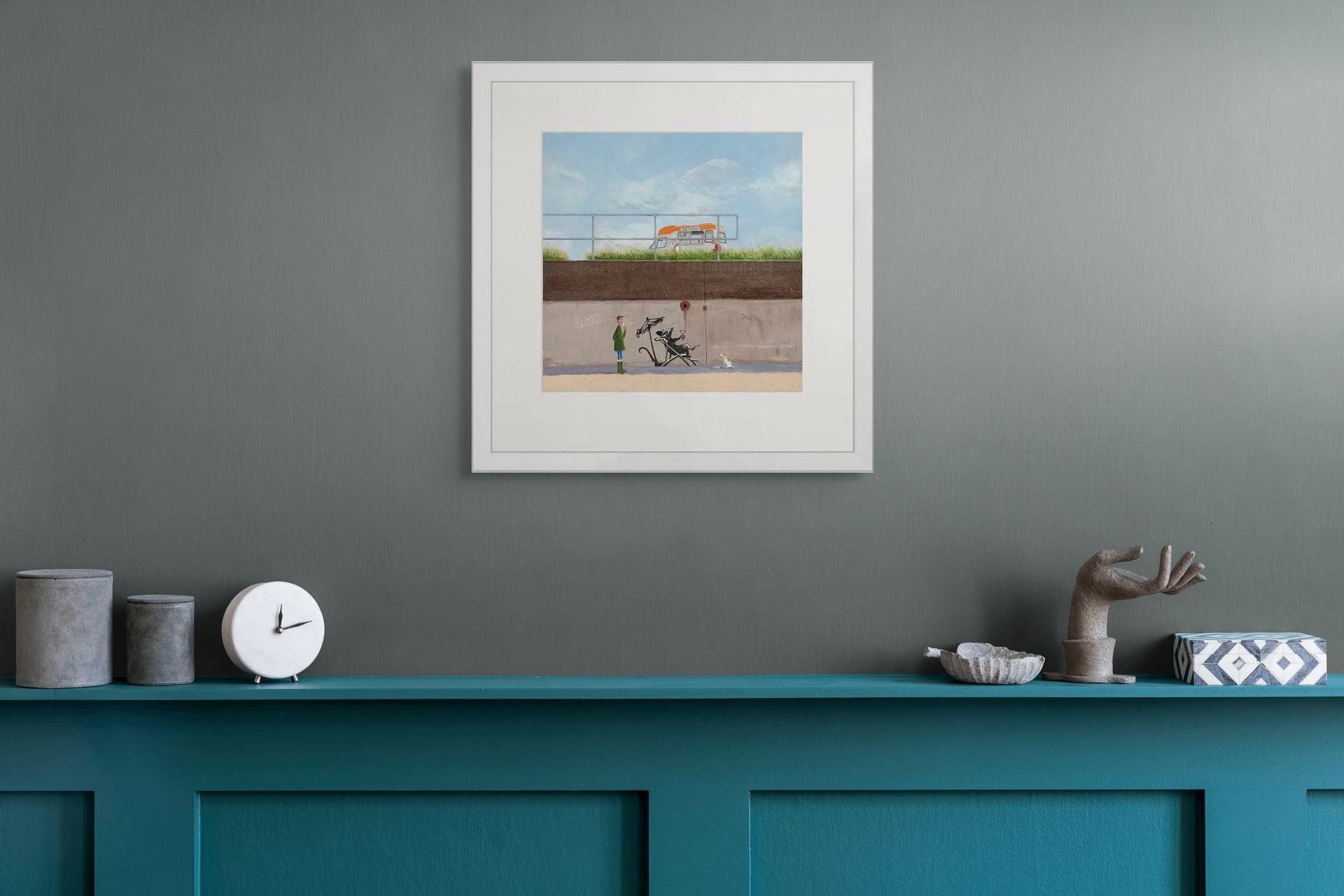 Chillin' limited edition artwork by Chris Ross Williamson. The artwork features Chris' character creations - Garfield Eldritch and his faithful companion dog Barton Darcy. Enjoying an ice cream on the beach with a Banksy graffiti artwork for a view - rather than the sea! All of Chris' works of art have a dedicated four line poem which accompanies the Certificate of Authenticity. The poem with this artwork reads:
