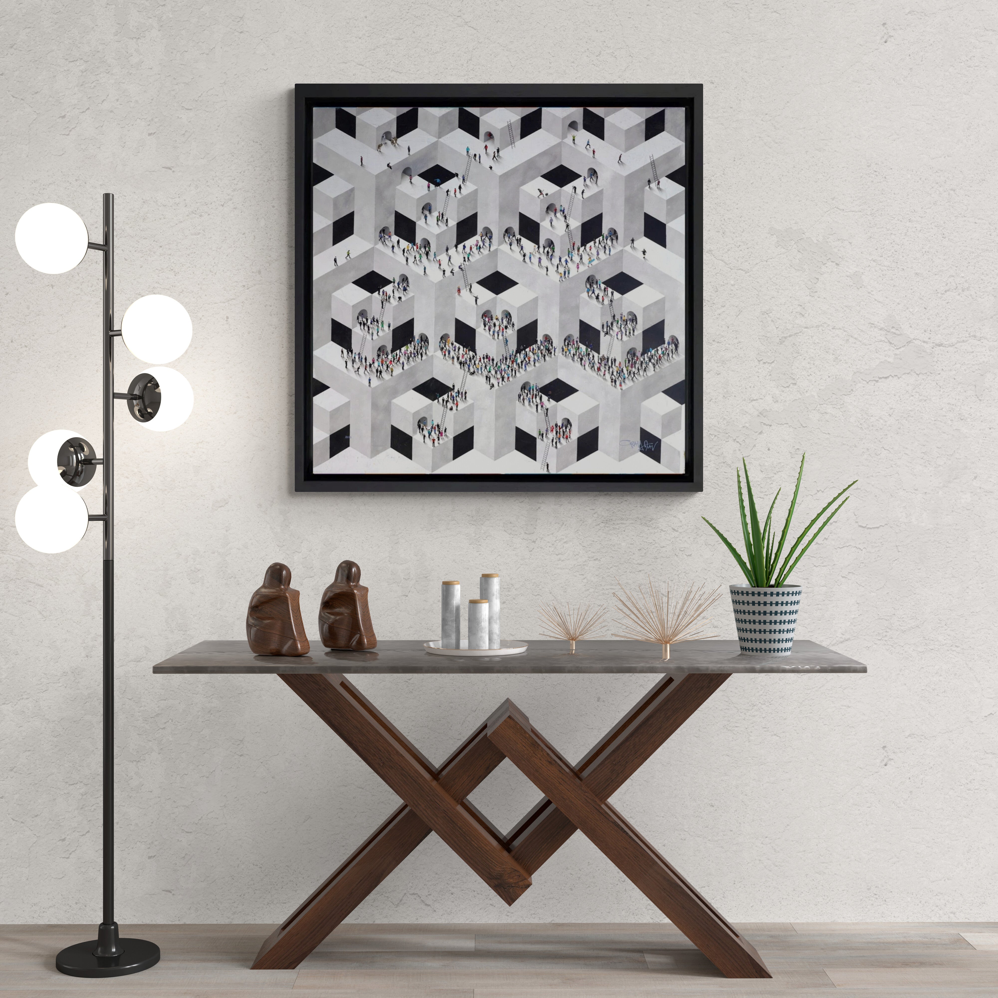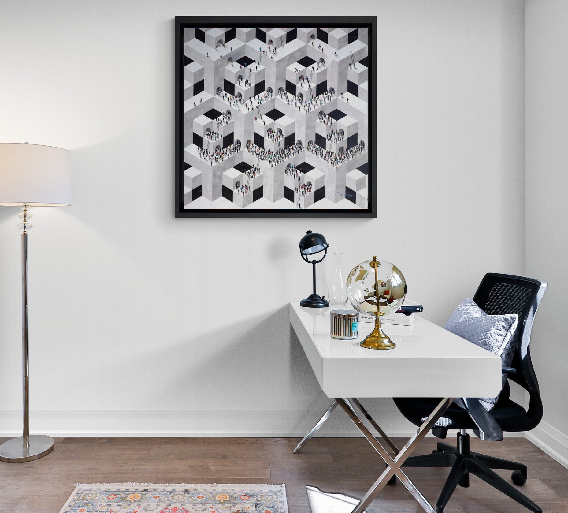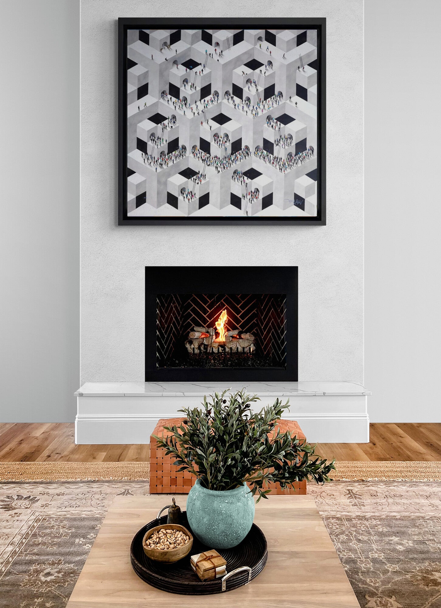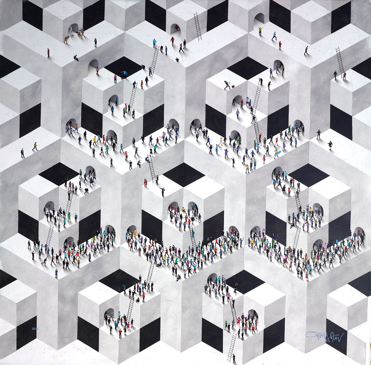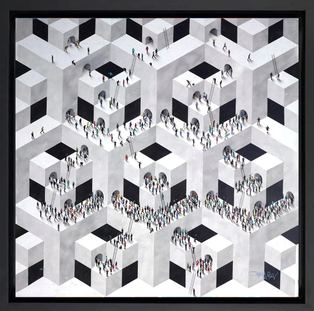 Hallpass by artist Craig Alan uses detailed figures to create this calm yet chaotic scene, the subjects of the image coming together to navigate through the M.C. Escher style platforms within the design. A master of perspective, many hours can be spent in awe at the detail within this beautiful artwork.