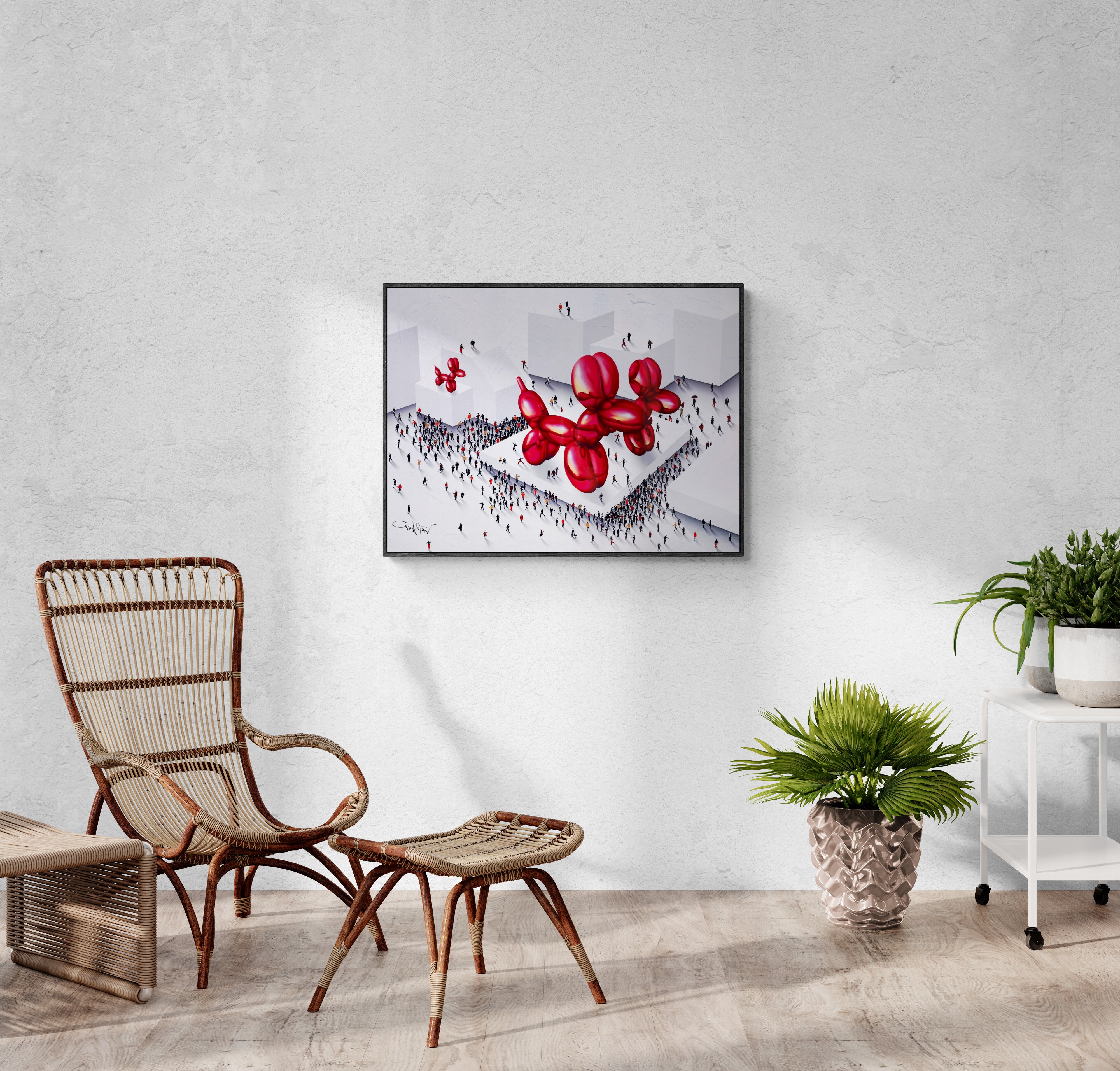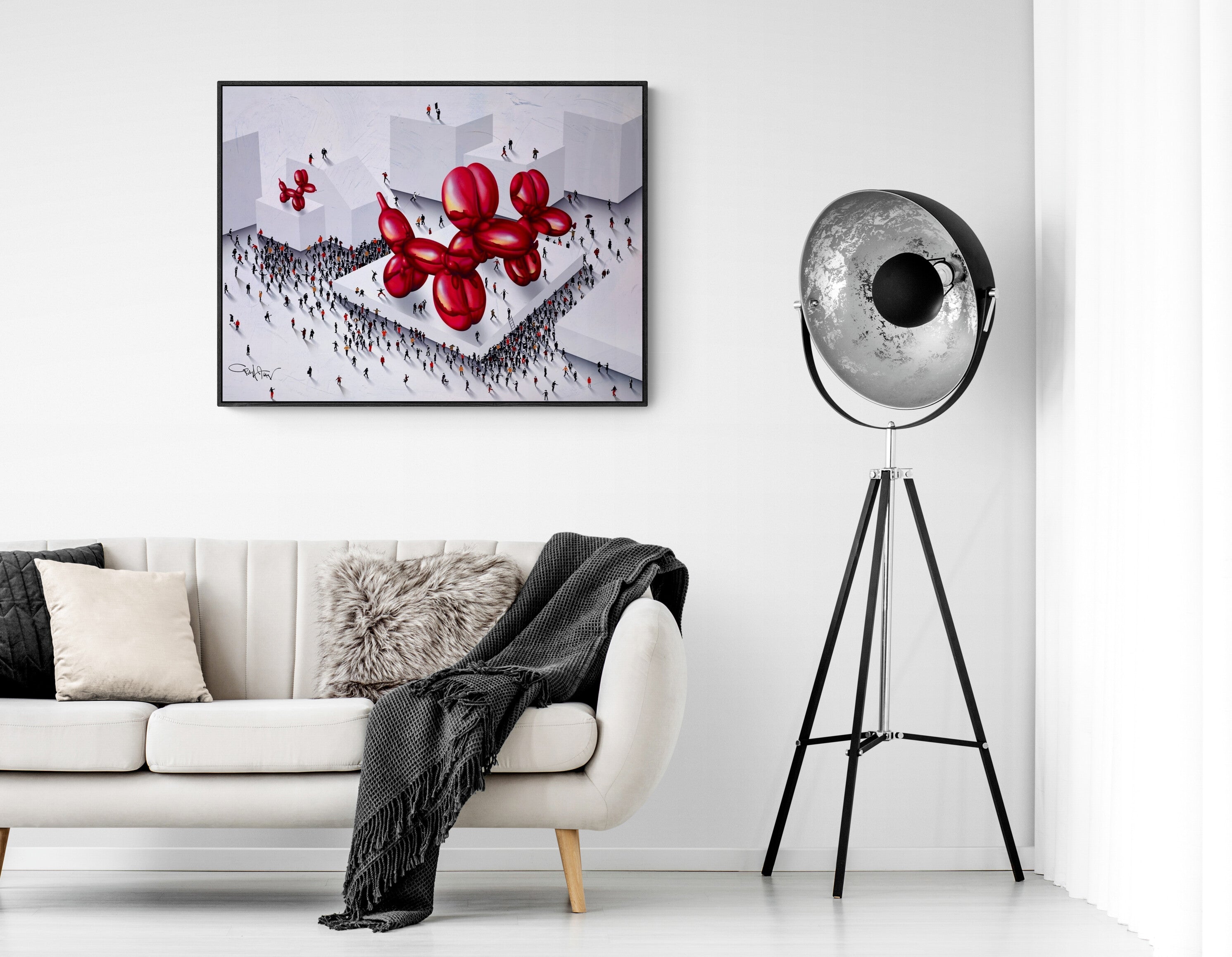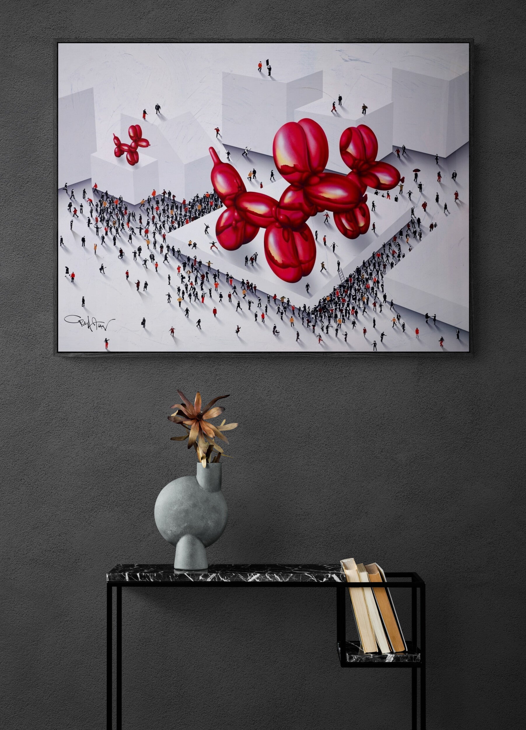 Helium Hounds by Craig Alan features red balloon dogs inspired by Jeff Koons, with a crowd coming together around the sitting red dogs. This inspirational piece is the ideal centrepiece for a fine art collection, the recognisable style of Craig Alan is delicate yet impactful.