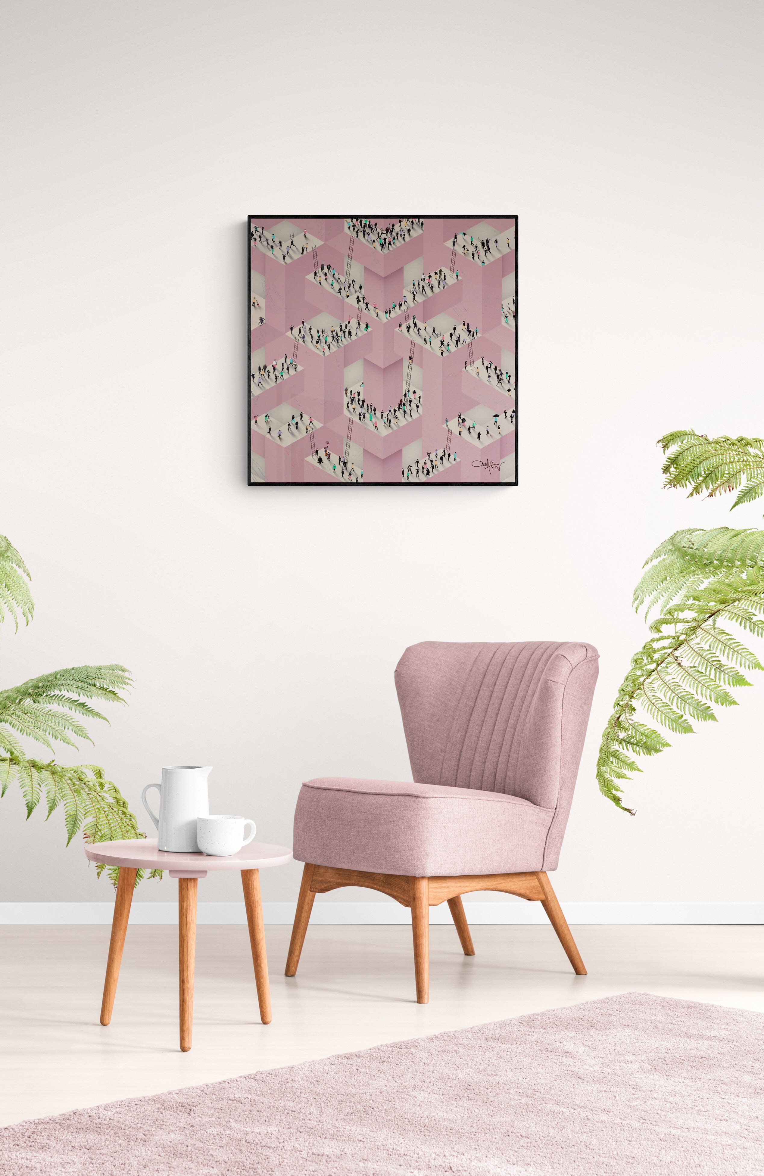 Monster Mash by artist Craig Alan uses detailed figures to create this calm yet chaotic scene, the subjects of the image coming together to navigate through the M.C. Escher style platforms within the design. A master of perspective, many hours can be spent in awe at the detail within this beautiful artwork.