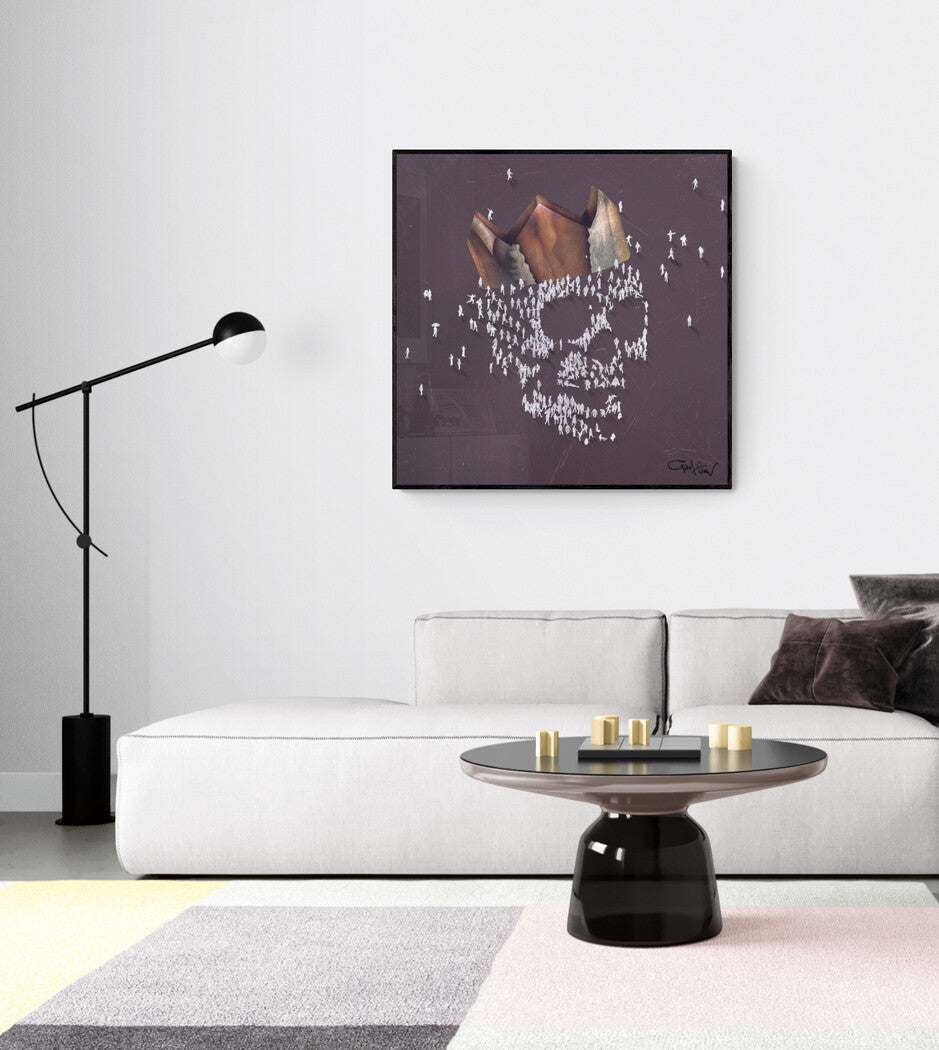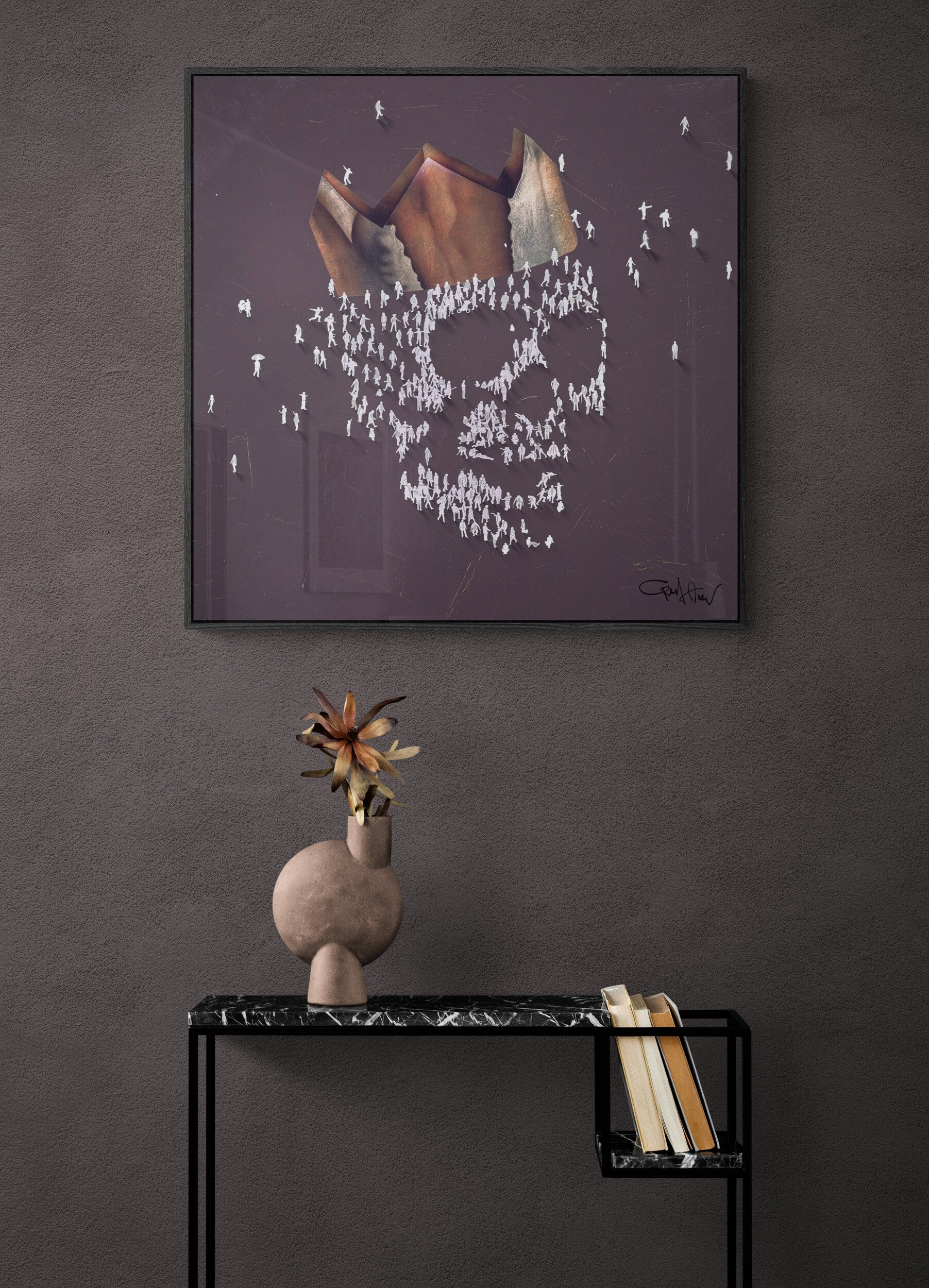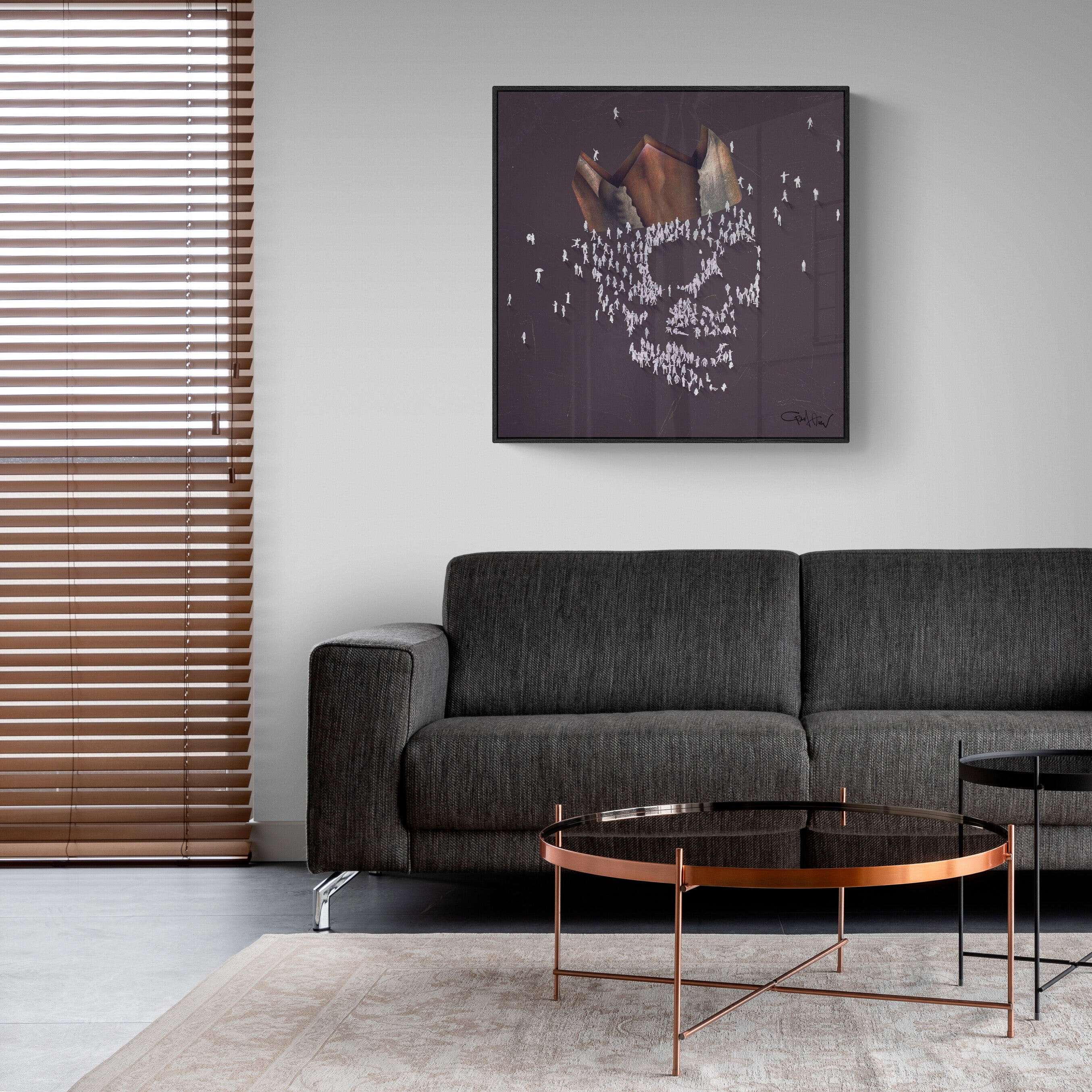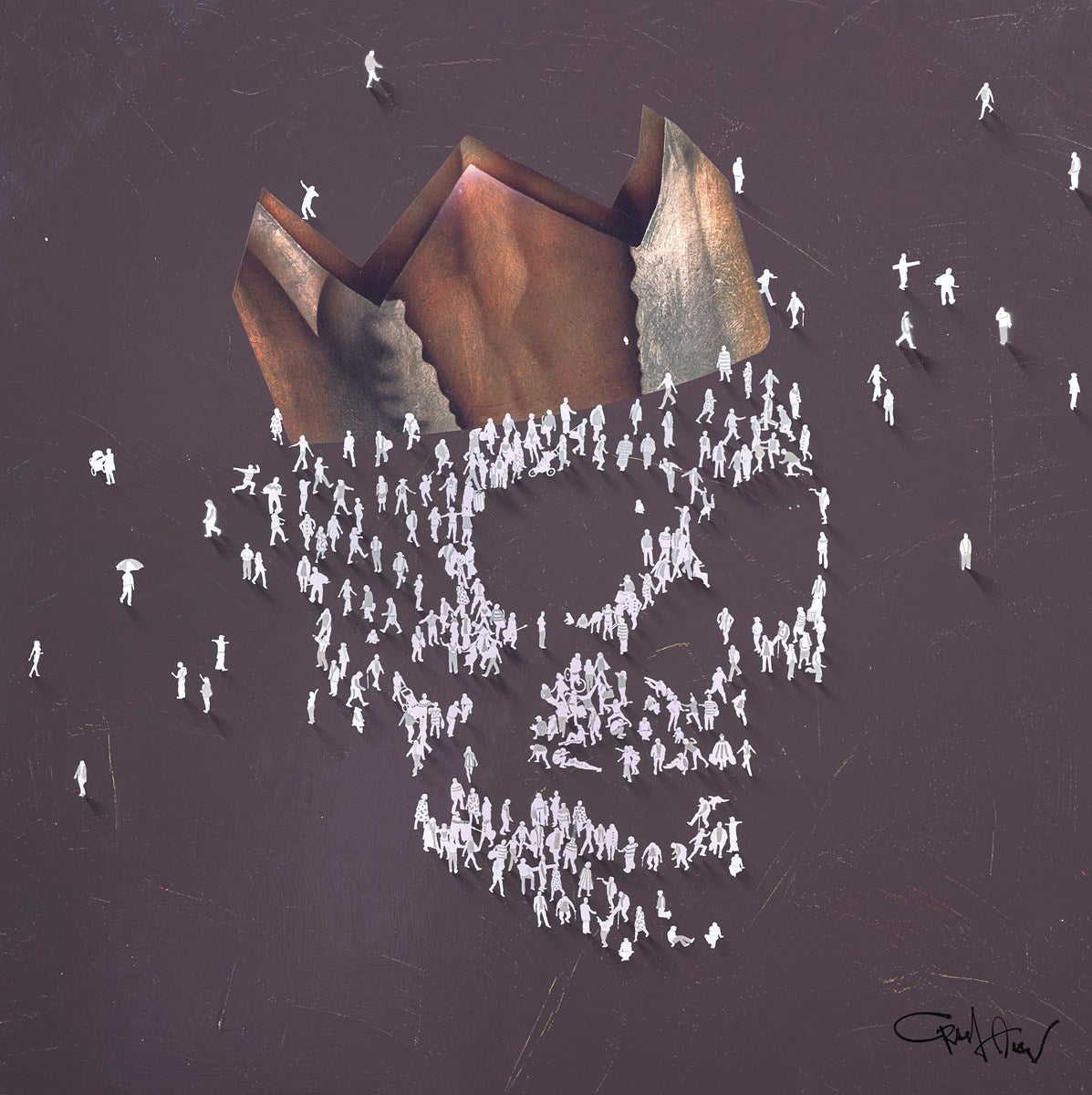 Prospective Victor by Craig Alan features a crowd gathering on a dark grey backdrop, coming together to form a white skull wearing a golden crown on its head. This inspirational piece is the ideal centrepiece for a fine art collection, the recognisable style of Craig Alan is delicate yet impactful.
