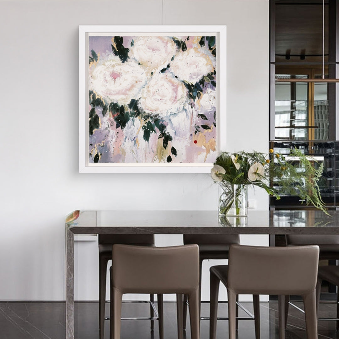 A Strength Unspoken by artist Danielle O'Connor Akiyama is an abstract landscape scene, with delicate layers of pale blush, ivory, and cream roses unfurl amidst soft washes of lilac, gold, and muted green, forming a composition that feels radiant and full of quiet joy. Danielle's work embraces vivid colours with bold strokes, her work is inspired by tranquil landscapes translated in to her signature abstract style and is prized among art collectors and investors.