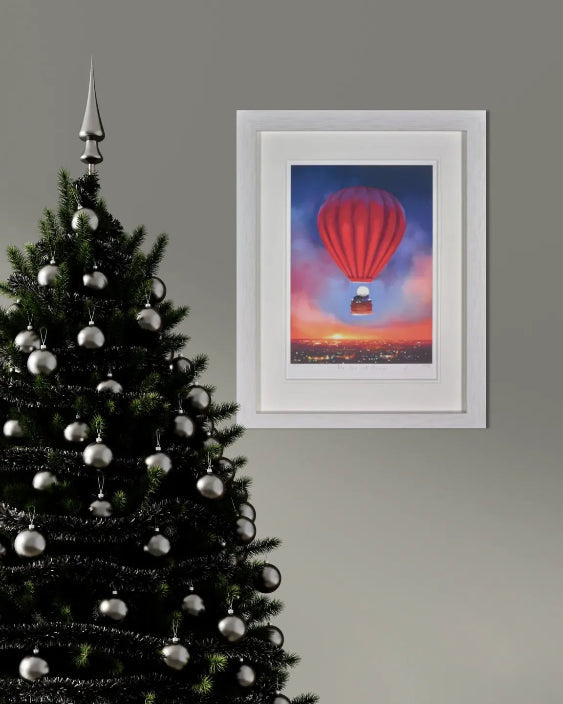 Up Pup and Away is an artwork featured in Doug Hyde's brand new collection for Summer 2025. This artwork is inspired by city lights and familiar horizons for the artist and the impact of these captivating landscapes. This artwork captures that feeling, imagining the incredible view of countless lights spread out below the hot air balloon containing Doug Hyde's famous character and their fluffy companion.