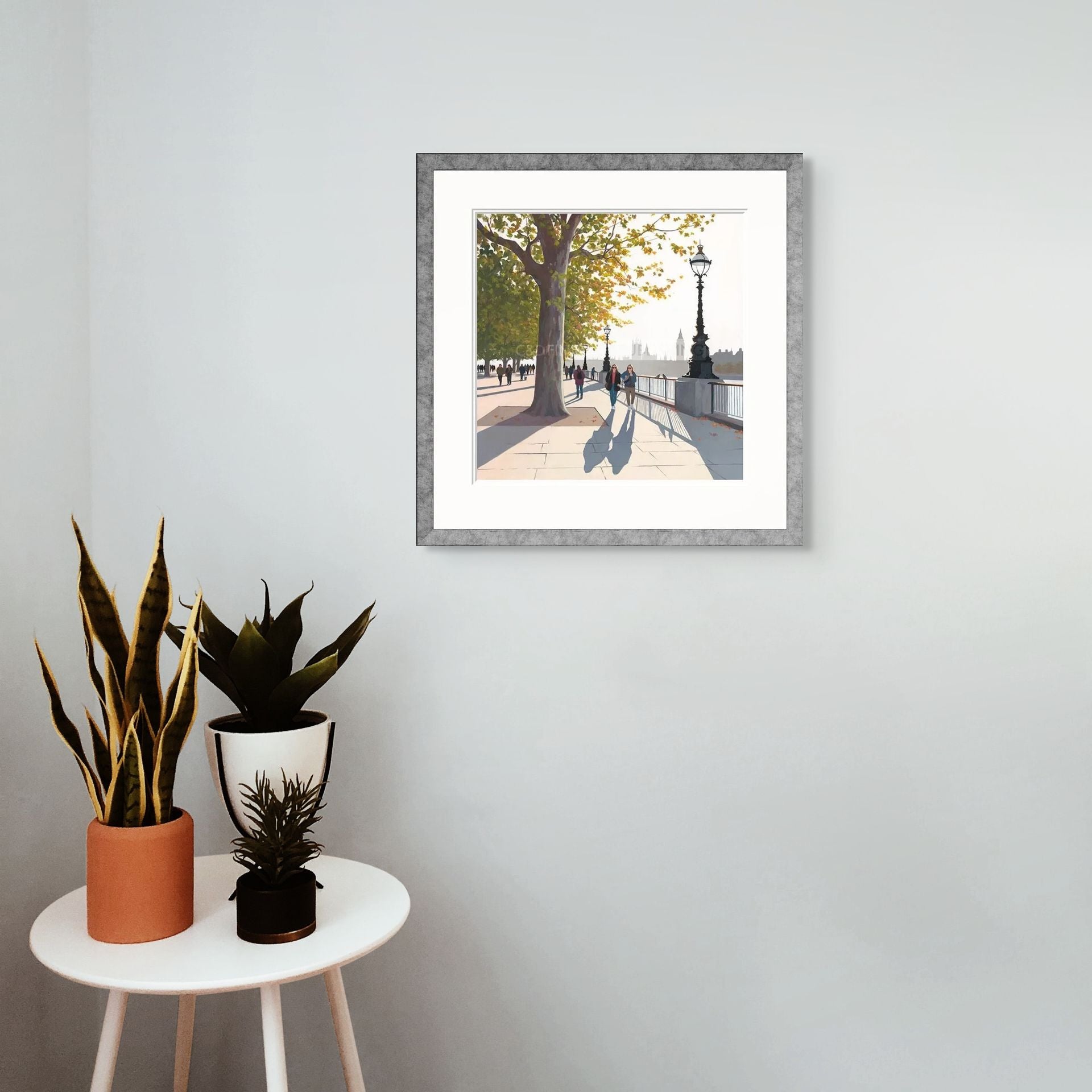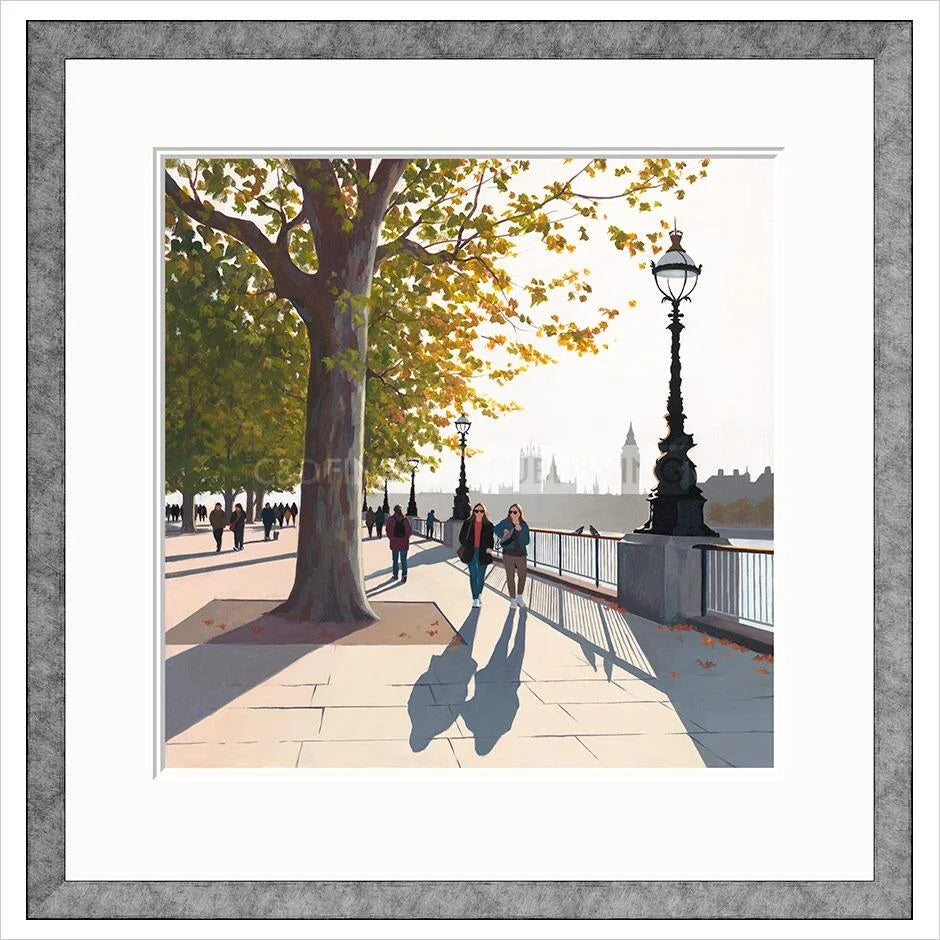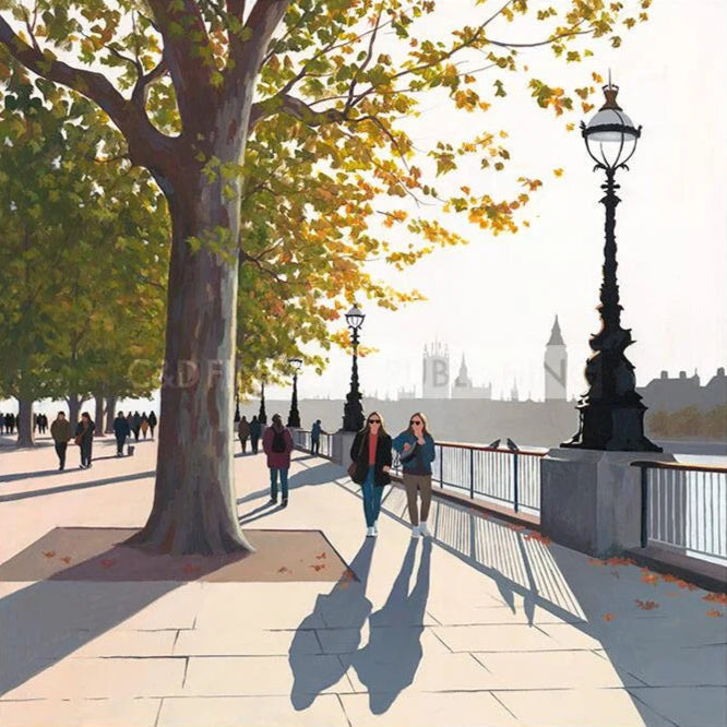 Early Autumn on the Queen's Walk is a seasonal stroll along the bank of the river Thames by artist Jo Quigley. Jo Quigley is a celebrated urban artist inspired by moments captured in bustling cities in a commentary on the pace of modern life, her artwork is detailed and captivating, encouraging the viewer to delve in to the work.