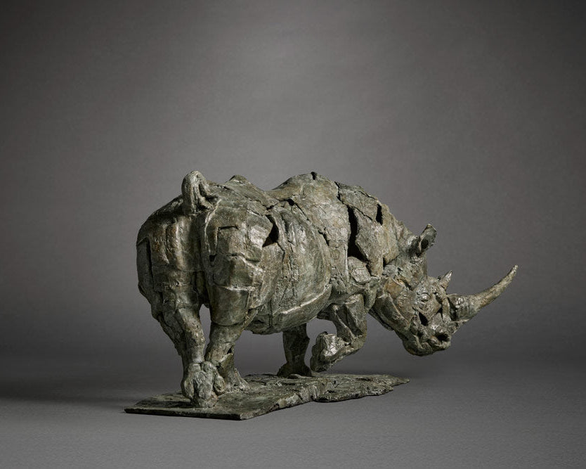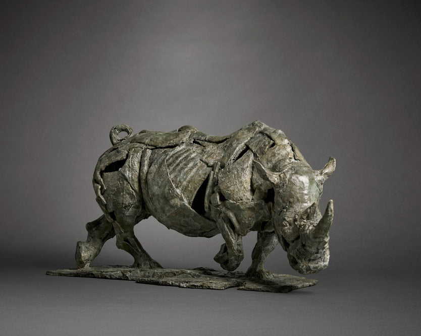 White Rhino II by Sculptor Fred Gordon captures captures the raw power and quiet resilience of the white rhino, the rhino's posture, head lowered, shoulders braced, legs in motion, conveys determination and primal weight. This majestic sculpture is suitable for display both indoors and outdoors, making it a beautiful addition to any space. Fred’s sculptural process is distinguished by his use of layered casting wax, developed during his years working in a bronze foundry. This technique introduces spontaneity, abstraction, and a sense of fragmentation to the forms, while still conveying anatomical accuracy and emotional depth. His bronzes are cast using the traditional Lost Wax Method, each wax master used only once, and finished with richly marbled patinas in natural tones of grey, green, and brown.