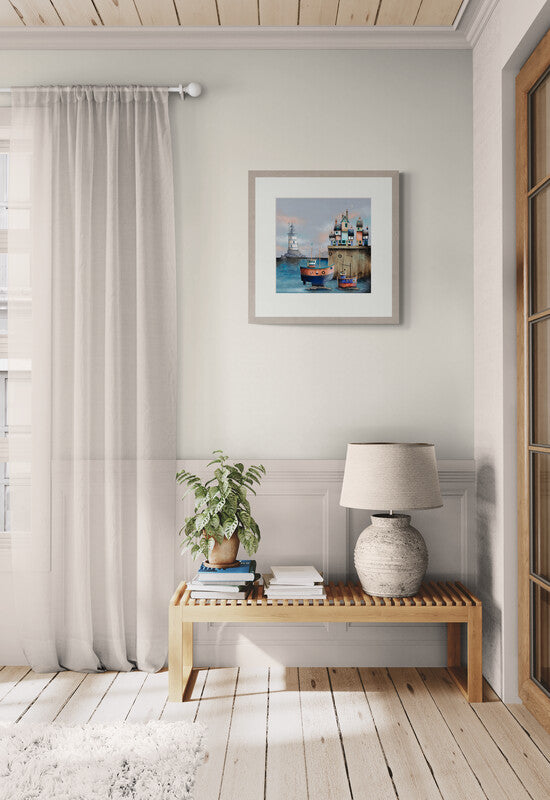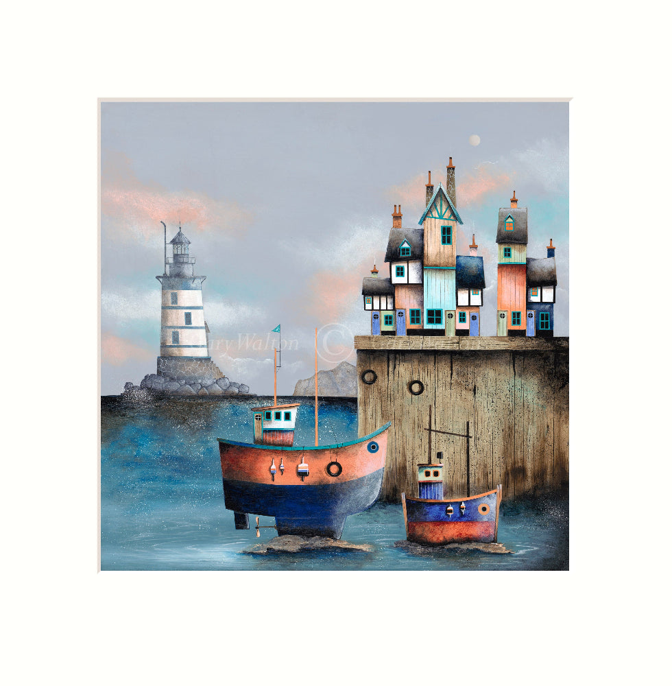 On an Even Keel depicts a pair of charming orange and blue boats floating in the vibrant blue sea, combined with a charming set of colourful houses and tall lighthouse in the background surrounded by the pastel orange and blue sky. We are pleased to be able to offer both Gary Walton's limited edition artwork plus Original paintings and sketches. Walton's art is centred around the coast, an imagined world of whimsical buildings and boats often featuring lighthouses and hot air balloons.
