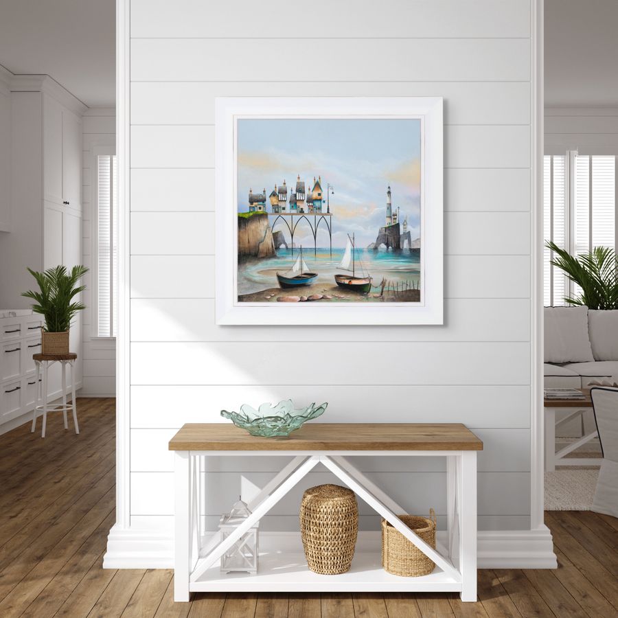 Rest Ashore by Gary Walton features two whimsical boats sit together beached on the shoreline on a calm day, a lighthouse juts out of the seascape in the backdrop, next to a row of houses standing tall on the coastline. We are pleased to be able to offer both Gary Walton's limited edition artwork plus Original paintings and sketches. Walton's art is centred around the coast, an imagined world of whimsical buildings and boats often featuring lighthouses and hot air balloons.