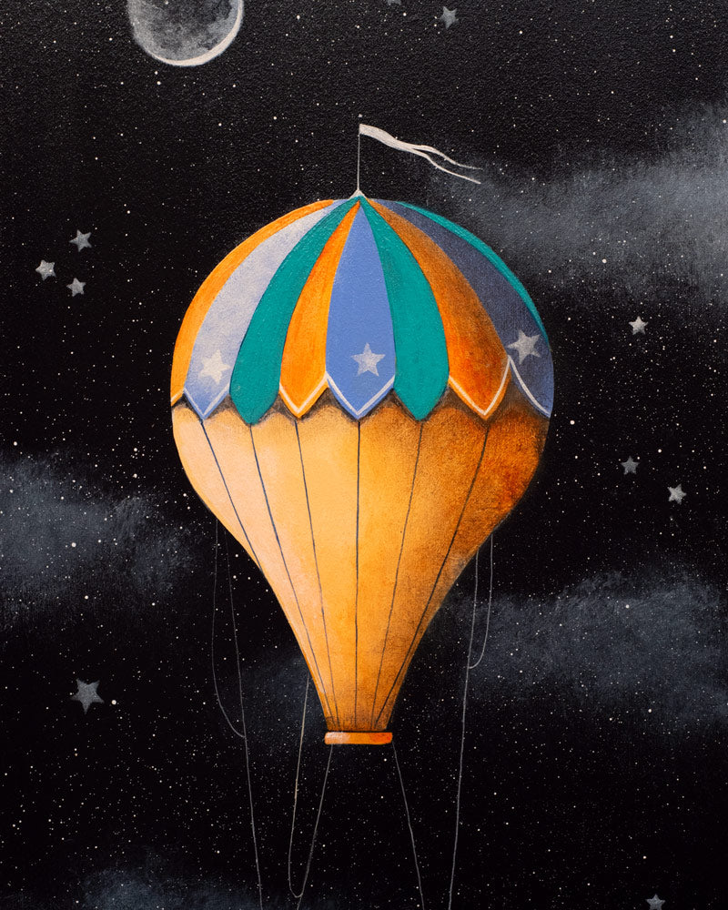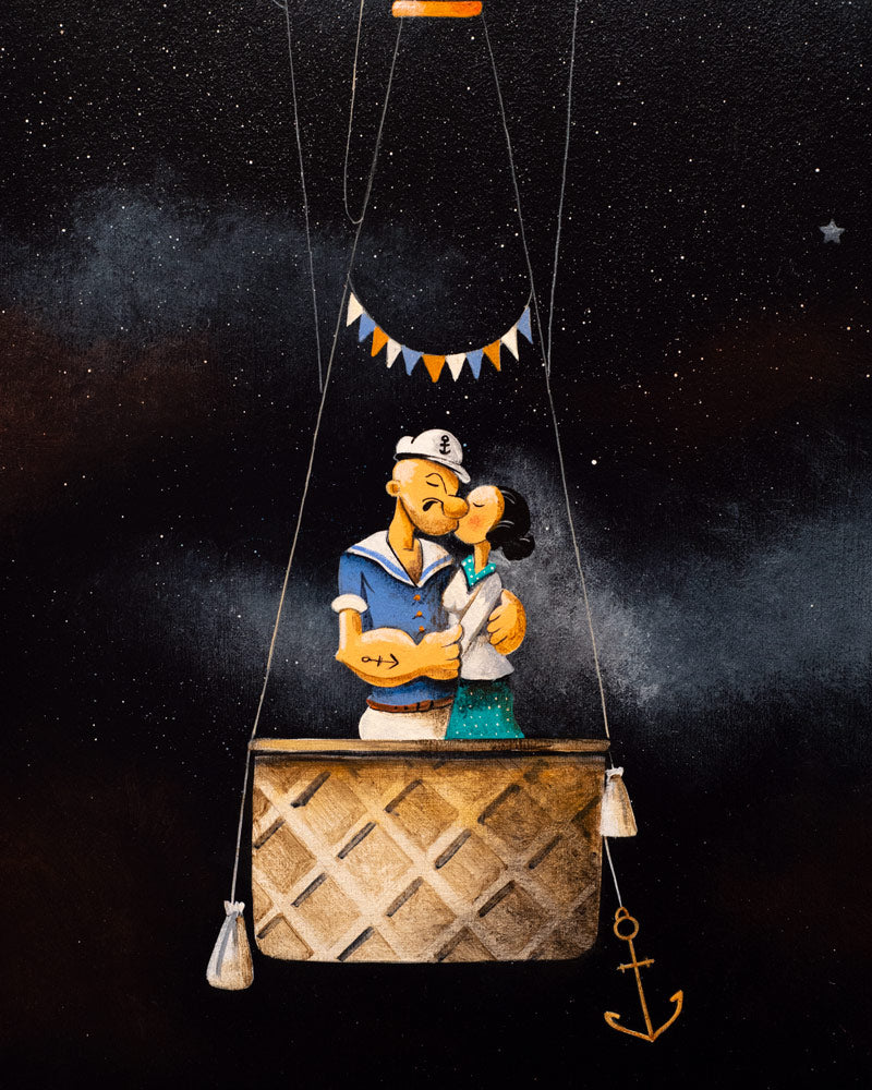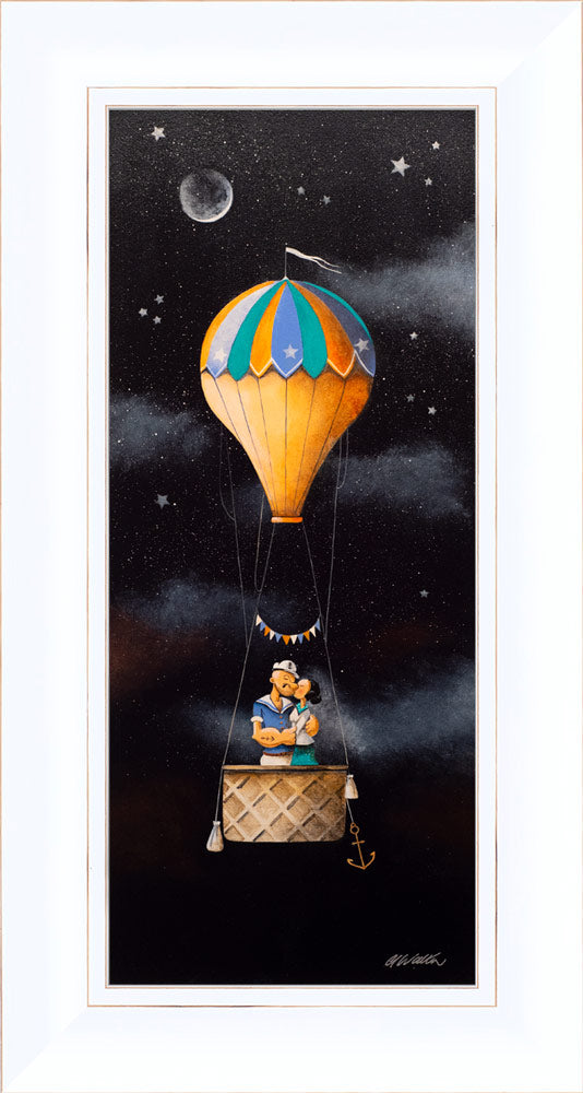Sailing with The Stars by artist Gary Walton is an original artwork and captures a sailor couple in a warm embrace as they float through the starry night sky. We are pleased to be able to offer both Gary Walton's limited edition artwork plus Original paintings and sketches. Walton's art is centred around the coast, an imagined world of whimsical buildings and boats often featuring lighthouses and hot air balloons.