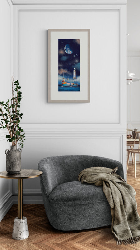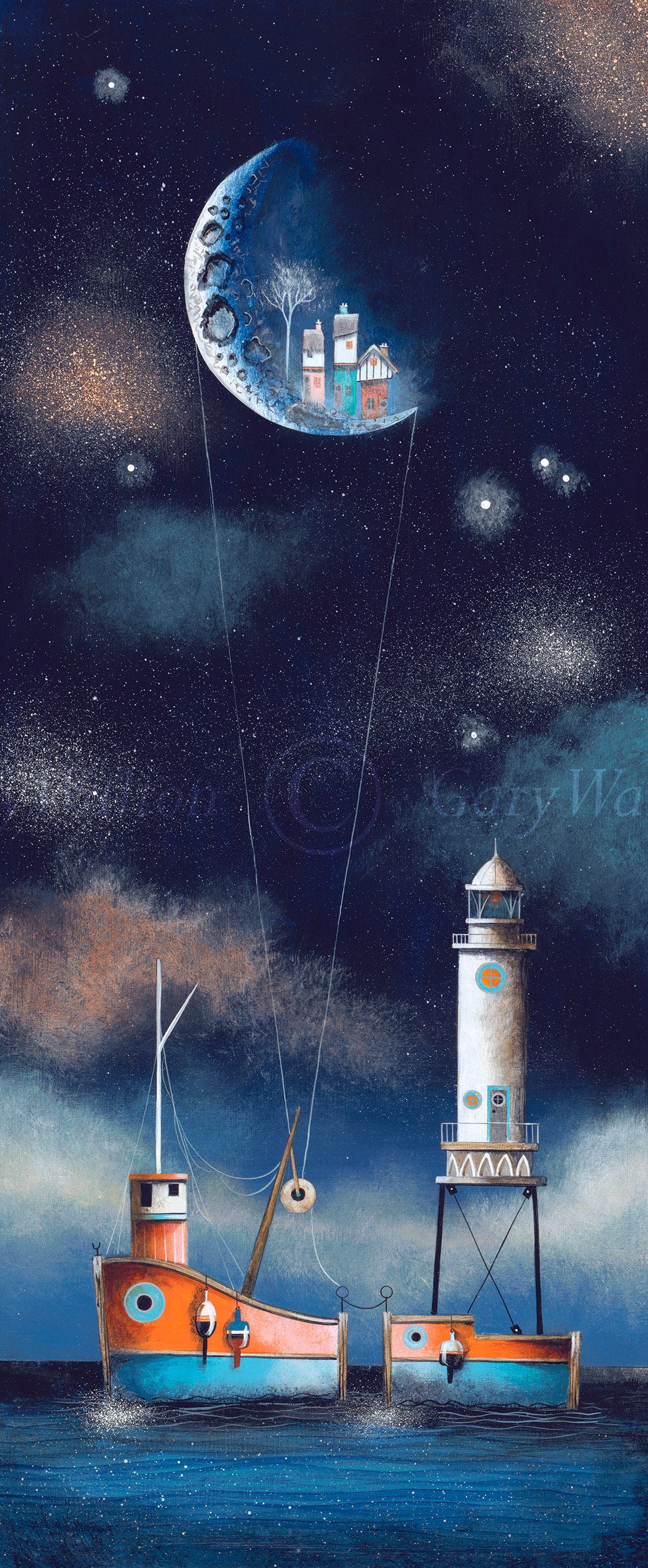 Tug with Gravity by artist Gary Walton is a surrealist artwork capturing two small orange fishing boats floating beneath the dark moonlit night, a lighthouse can be seen standing tall on a platform in this calm and relaxed scene. We are pleased to be able to offer both Gary Walton's limited edition artwork plus Original paintings and sketches. Walton's art is centred around the coast, an imagined world of whimsical buildings and boats often featuring lighthouses and hot air balloons.