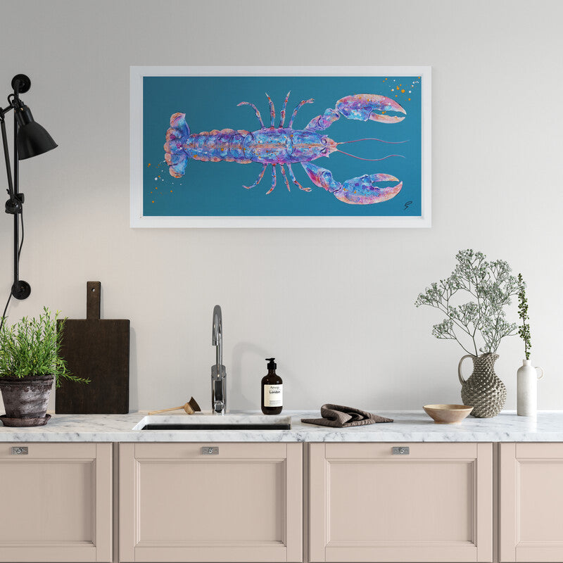 This Lobster III by artist Giles Ward is a close up study of a vibrant lobster, set against a rich blue background. Giles Ward is known for his detailed marine life artwork, with highly textured sea life and all kinds of underwater animals, his work is detailed and colourful bringing the beautiful creatures to life.
