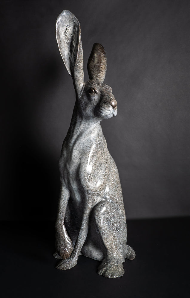 Sitting Hare by Gill Parker depicts a large grey hare sitting on the ground. Gill’s first bronzes were acquired by Garrard and Asprey in 1983, followed by her solo debut at the Sladmore Gallery in 1984. Now a leading sculptor of equine and wildlife subjects, her work, including major commissions like the life-size bronze of Motivator at Ascot, is held in public, private, and Royal collections worldwide for its timeless beauty and craftsmanship.