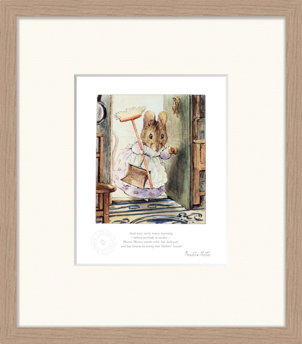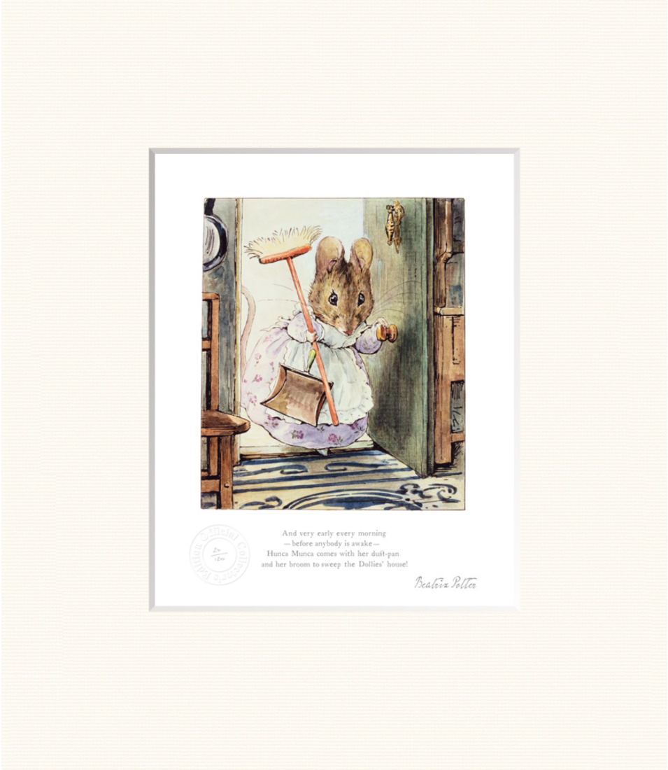 Hunca Munca with her Dust-Pan by illustrator Beatrix Potter captures a scene from the book Two Bad Mice. Featuring Hunca Munca with her dust-pan and brush arriving at the Dollies' house. Loved by adults and Children alike, this Official Collectors Edition artwork makes a fantastic gift for a child's bedroom, or as a nostalgic piece ideal for a quiet reading space in your home.