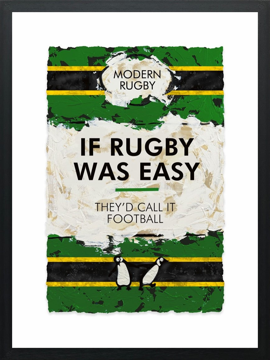 Celebrate the spirit, grit, and humour of Northampton Saints with this vibrant mixed-media artwork by British Urban Pop artist Hue Folk. Featuring the club’s iconic green, black, and gold palette, with the tongue-in-cheek phrase: “If Rugby Was Easy, They’d Call It Football.” Hue Folk’s signature style—bold colours, textured layers, and pop-culture-infused wit brings a modern, energetic twist to sports-inspired art. Whether you’re a Saints supporter, a rugby enthusiast, or simply love contemporary pop art that stands out, this piece makes a dynamic statement in any home, office, or fan space.