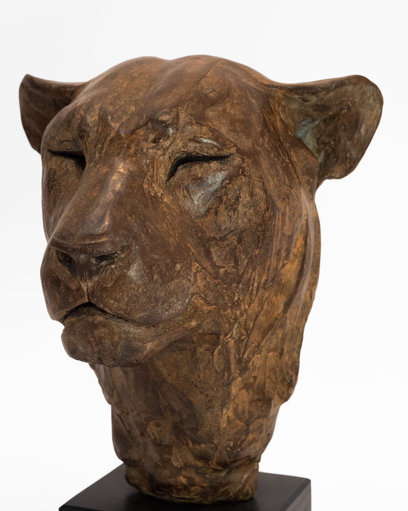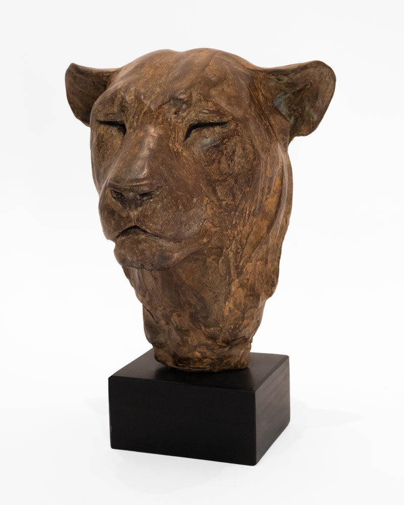 Lioness by Jenna Gearing depicts a striking and textured lioness head. Jenna creates figurative pieces, primarily in bronze, that capture the personality, movement and emotion of her subjects, whether human or animal. Her practice centres on three key processes: capturing, interpreting and representing the character of her subjects, using live sittings or photographs to inform detailed clay modelling that is then cast with dynamic patinas.