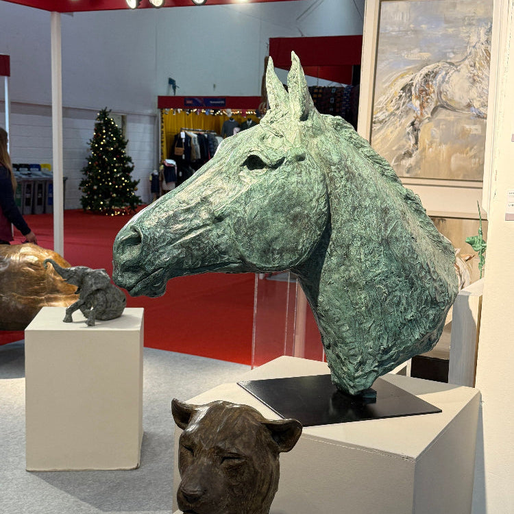 The Green Horse by Jenna Gearing is a striking, sculptural bust and captures the quiet power and sensitivity of the horse through bold form and expressive surface. Cast in bronze and finished with a rich green patina, the work has a timeless, almost archaeological presence, evoking both classical equine sculpture and contemporary abstraction. Jenna creates figurative pieces, primarily in bronze, that capture the personality, movement and emotion of her subjects, whether human or animal. Her practice centres on three key processes: capturing, interpreting and representing the character of her subjects, using live sittings or photographs to inform detailed clay modelling that is then cast with dynamic patinas.