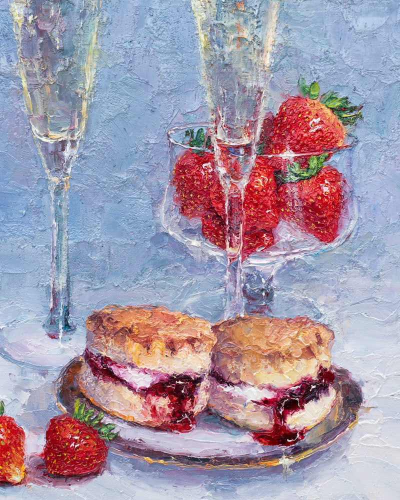 Champagne and Scones III by Lana Okrio is an original still life painting depicting champagne flutes surrounded by fresh strawberries and scones. The rich texture of this artwork transforms into stunningly realistic still life when viewed from a distance. Crafted with a careful blend of colours, with evocative shades expertly arranged to capture nature's essence with both precision and elegance. Lana's unique artistic style has evolved over time, inspired by the works of renowned masters she admires, such as Paul Cézanne and Claude Monet. She primarily works with oil on canvas, using bold strokes and vibrant colours to craft contemporary interpretations that combine vividness with an unexpected touch of subtlety.