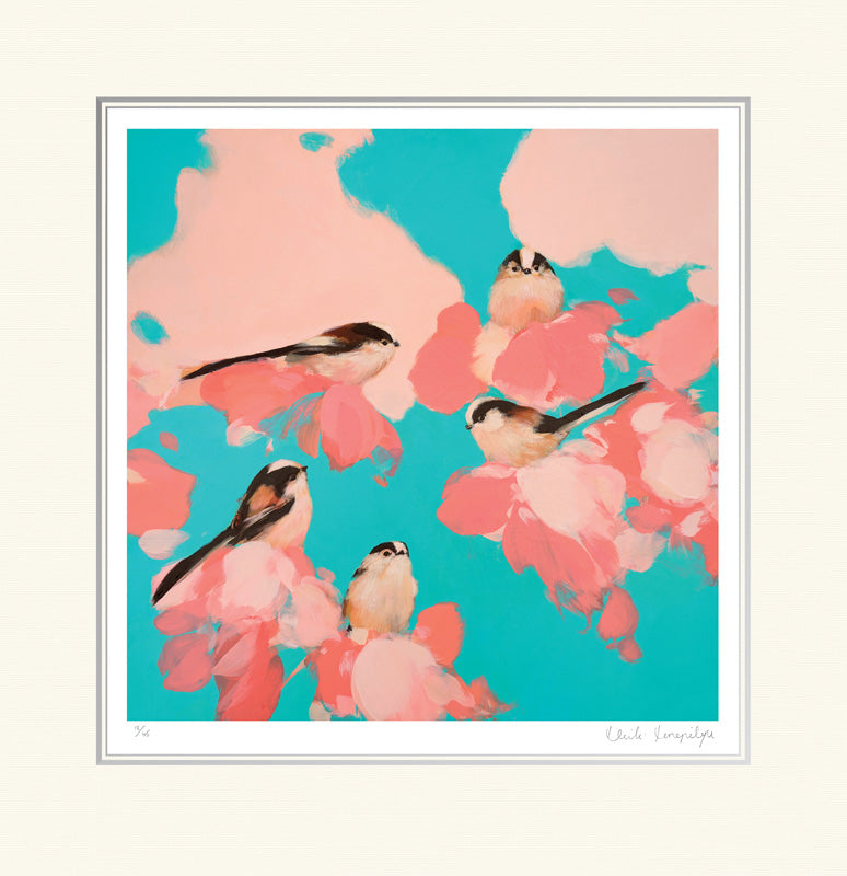 Long-tailed Tits in Blue and Pink by artist Heidi Langridge is an Signed Giclée Limited Edition Print. Its tranquil subject of Long-tailed Tits - birds are gently perched amongst a pink and blue canopy of foliage. Known for her charming bird paintings, Heidi Langridge's work is calm and peaceful, her prints bring a sense of serenity to their surroundings and are a fantastic choice of artwork for a peaceful space.