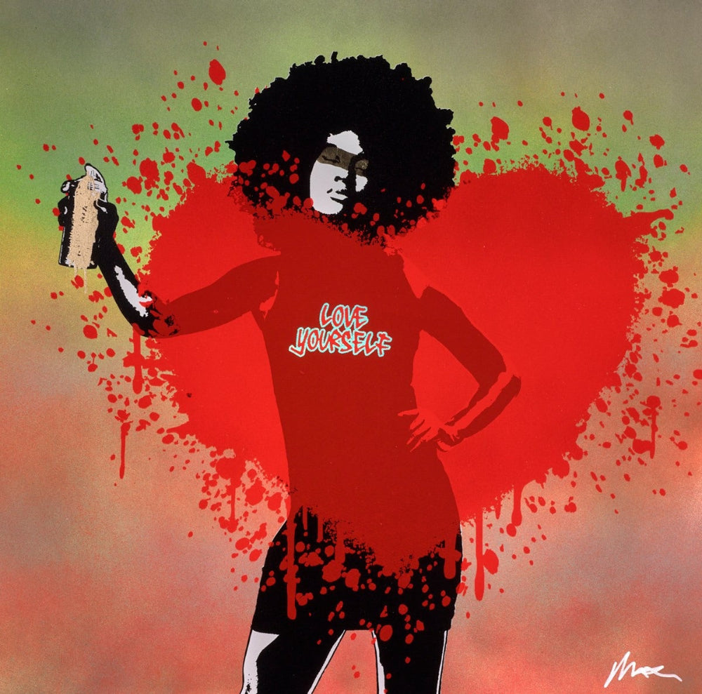 Endlessly is a visually striking original artwork by Maxim and celebrates self-love and empowerment. At its centre stands a confident female figure, spray can in hand, her shirt proclaiming “LOVE YOURSELF.” In front of her, a radiant red heart bursts across the canvas in expressive splashes and drips, evoking the raw energy of street art. A backdrop of soft greens, orange, and yellows contrasts beautifully with the fiery heart, creating a harmonious balance of vibrancy and calm. Through bold colour, texture, and movement, the piece captures the power of confidence, creativity, and emotion.