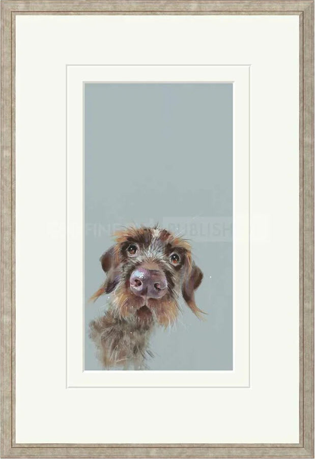 Mischievous by animal artist Nicky Litchfield captures the portrait of a German Wirehaired Pointer dog, staring noisily out of the frame with a blue grey background. Nicky Litchfield is a talented British artist creating works of art using animals as her subject matter. Her work is characterised by coloured backgrounds with the animal often placed off centre which adds to the character & personality of the art.