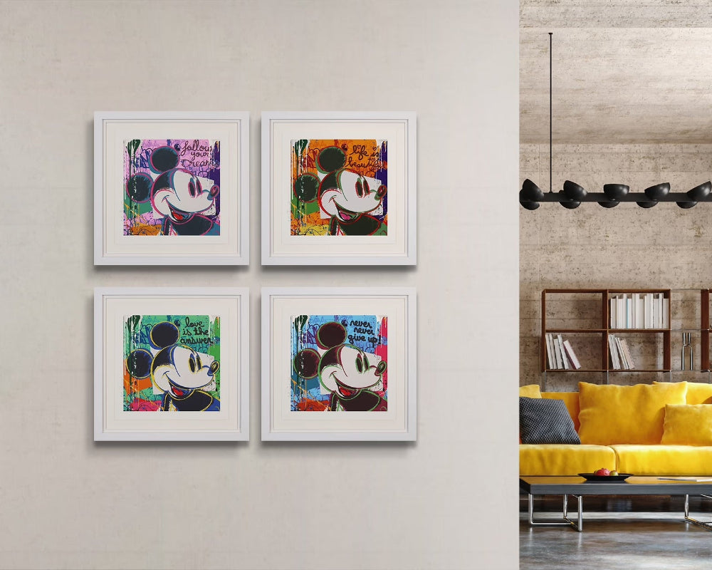 Bright Shades of Mickey striking set of 4 by world-renowned street artist Mr. Brainwash brings us his official collaboration with Disney. This special set includes the silkscreen on paper editions Follow Your Dreams, Life is Beautiful, Love is the Answer and Never, Never Give Up. Each contemporary work features the iconic Mickey Mouse in a different vibrant, neon-bright colour way, set against a lively backdrop filled with the artist’s signature positive affirmations. Mr. Brainwash’s artwork is an excellent choice for both investors and collectors, offering strong visual appeal and lasting value. Get in touch today to learn more about acquiring investment-grade art and adding a statement piece to your collection.