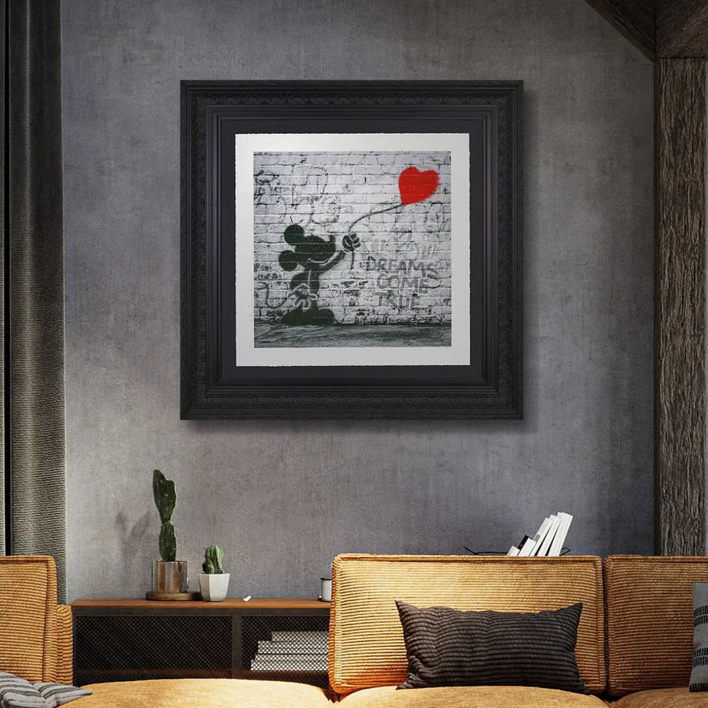 Dreams Come True - Deluxe by world-renowned street artist Mr. Brainwash brings us his official collaboration with Disney. This striking monochrome artwork depicts Mickey Mouse holding a bright red heart balloon against a graffiti-covered wall, blending street-art attitude with classic Disney charm. Bold, uplifting and imaginative, it stands as a powerful symbol of hope, creativity and the magic found in everyday moments. Mr. Brainwash’s artwork is an excellent choice for both investors and collectors, offering strong visual appeal and lasting value. Get in touch today to learn more about acquiring investment-grade art and adding a statement piece to your collection.