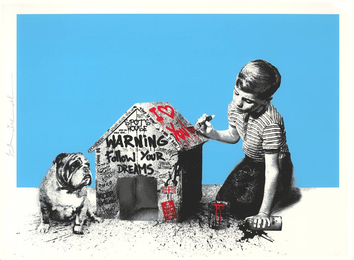 Spot's House - Blue by legendary street artist Mr. Brainwash captures a young boy and his pet bulldog, whose doghouse has been decorated with graffiti and street at slogans such as 'Warning, Follow Your Dreams' and 'I Love You', set against an impactful blue background. Mr. Brainwash is renowned for the heavily detailed style depicting Iconic elements inspired by his subject matter. His work is highly collected and is well situated for the investment market with consistent increases in value demonstrated over several years of growth.