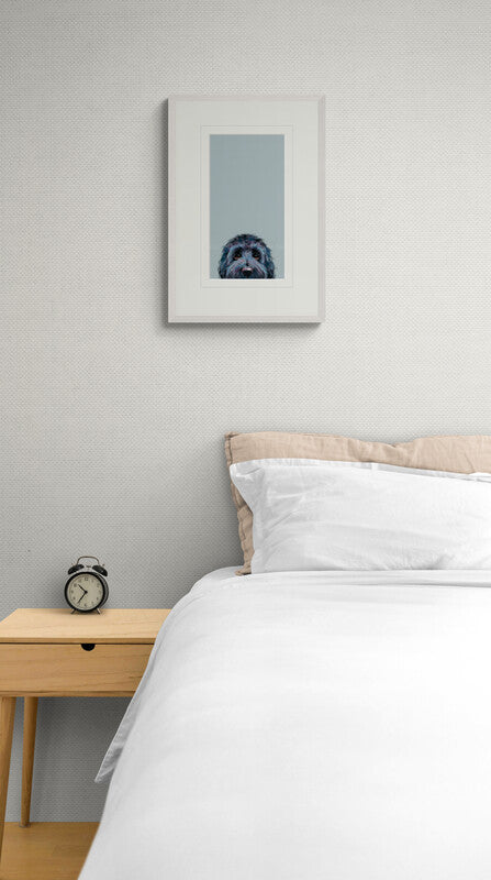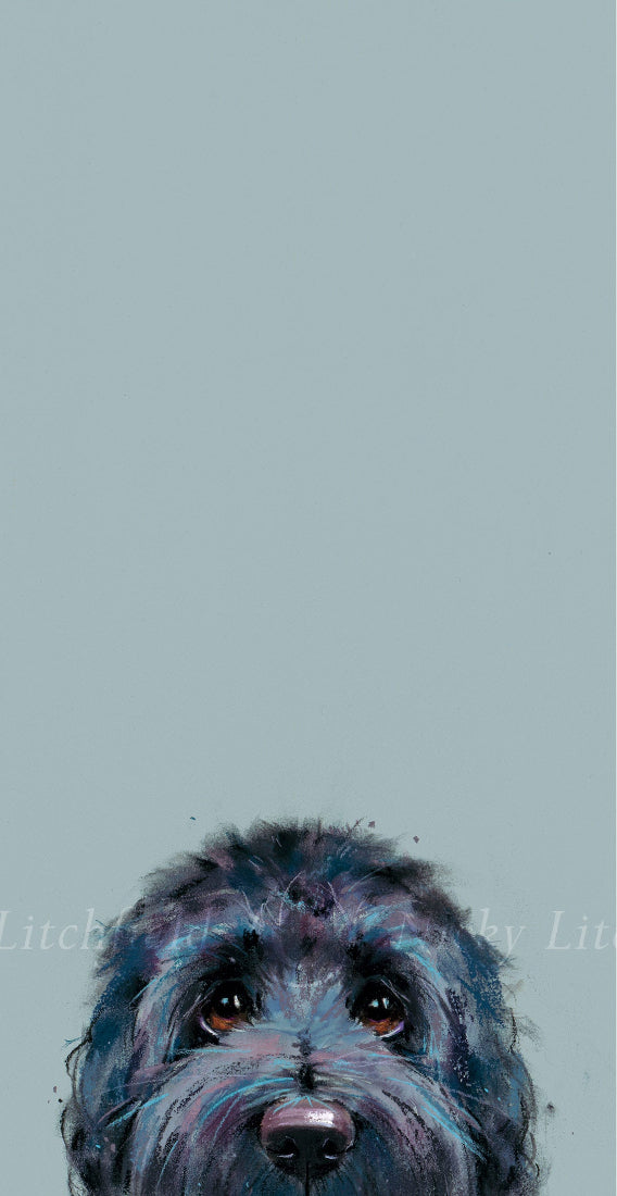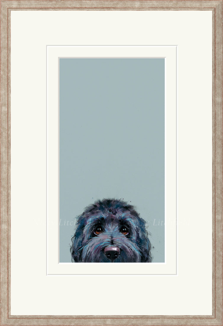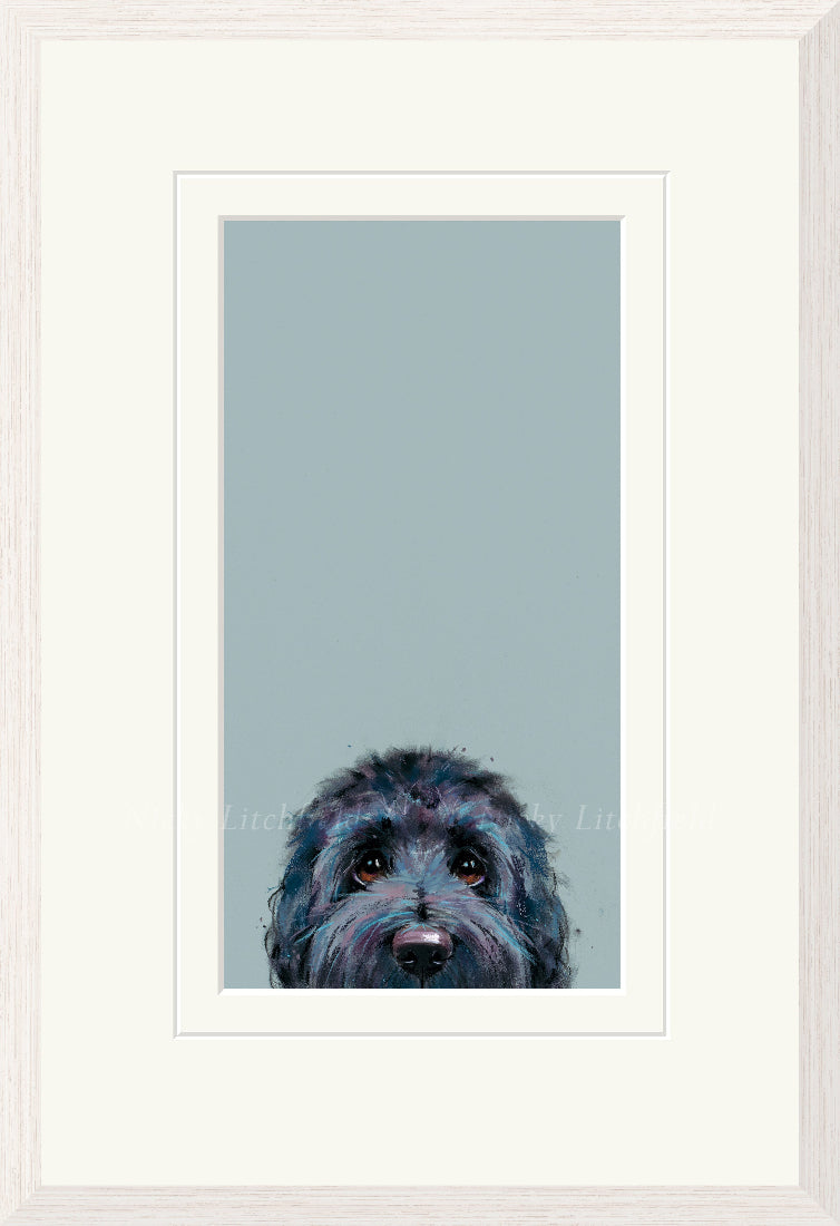 Cute Alert by artist Nicky Litchfield captures an adorable black Poodle peeking over the edge of the frame, surrounded by a duck egg blue background. Known for her charming animal paintings, Nicky Litchfield's work is often playful and captures the wide ranging personalities of her subjects beautifully, balancing the highly detailed portraits against a contrasting simply coloured background.