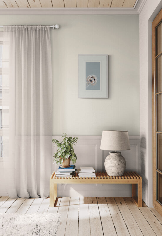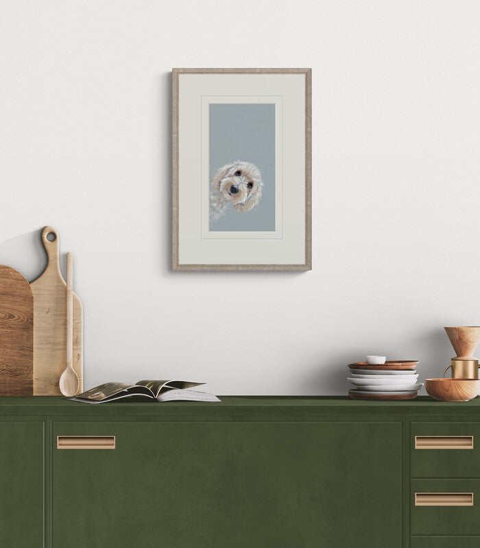 Don't Forget Me by artist Nicky Litchfield captures an adorable white Bichon Frise peeking over the edge of the frame, surrounded by a duck egg blue background. Known for her charming animal paintings, Nicky Litchfield's work is often playful and captures the wide ranging personalities of her subjects beautifully, balancing the highly detailed portraits against a contrasting simply coloured background.