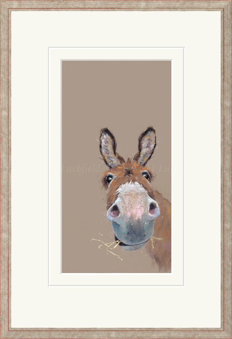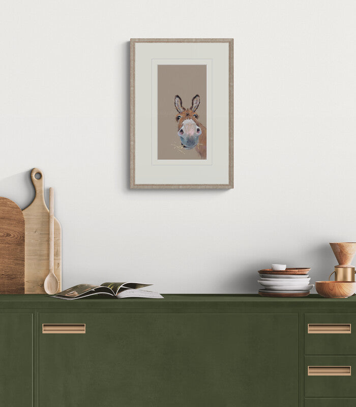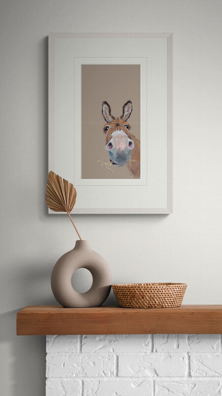 Elevenses by artist Nicky Litchfield captures a curious Donkey taking a short break for a yummy snack, surrounded by a mocha background. Known for her charming animal paintings, Nicky Litchfield's work is often playful and captures the wide ranging personalities of her subjects beautifully, balancing the highly detailed portraits against a contrasting simply coloured background.