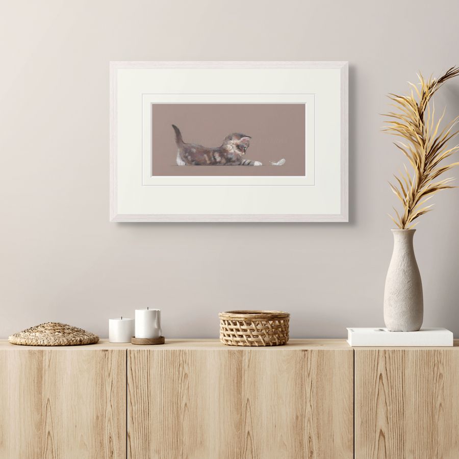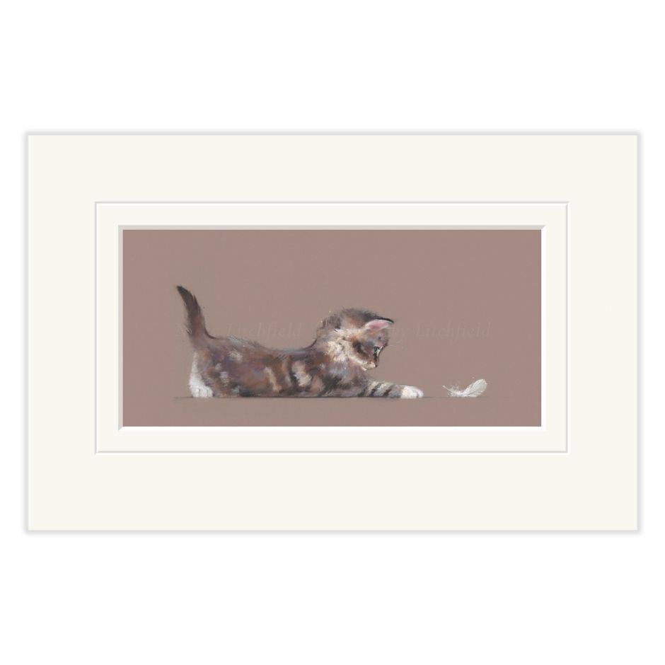 Balancing Act by artist Nicky Litchfield captures a cat playing with a delicate feather surrounded by a mocha background. Known for her charming animal paintings, Nicky Litchfield's work is often playful and captures the wide ranging personalities of her subjects beautifully, balancing the highly detailed portraits against a contrasting simply coloured background.