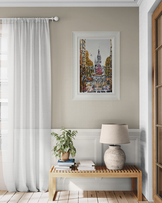 The Perfect View London by Nigel Cooke is an original artwork that captures an intimate balcony scene overlooking the iconic clock tower of Big Ben. Through expressive line work and layered texture, Nigel blends architectural detail with warm autumnal tones, creating a sense of quiet elegance and urban charm. The café table and chairs invite the viewer into the scene, evoking a moment of calm within the heart of the city. Atmospheric and refined, this artwork celebrates London’s timeless appeal.