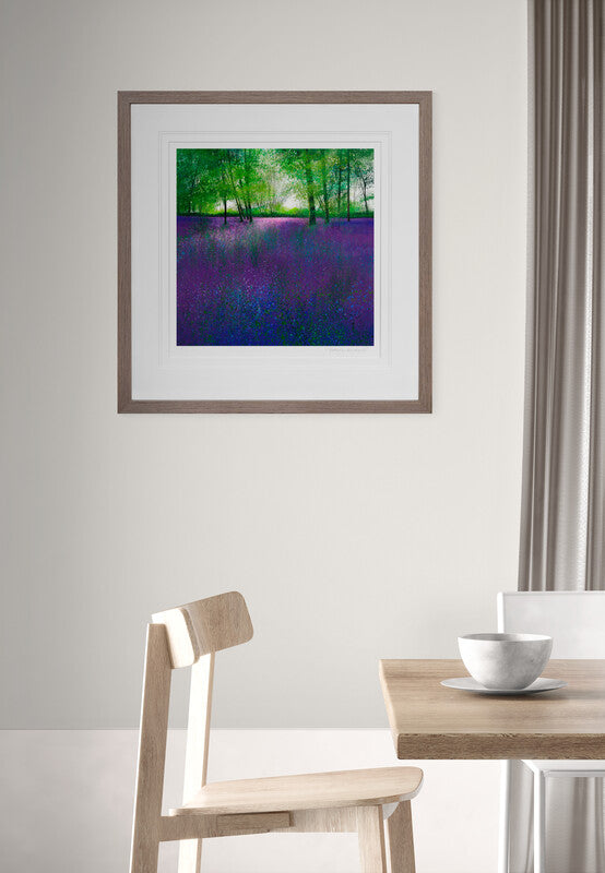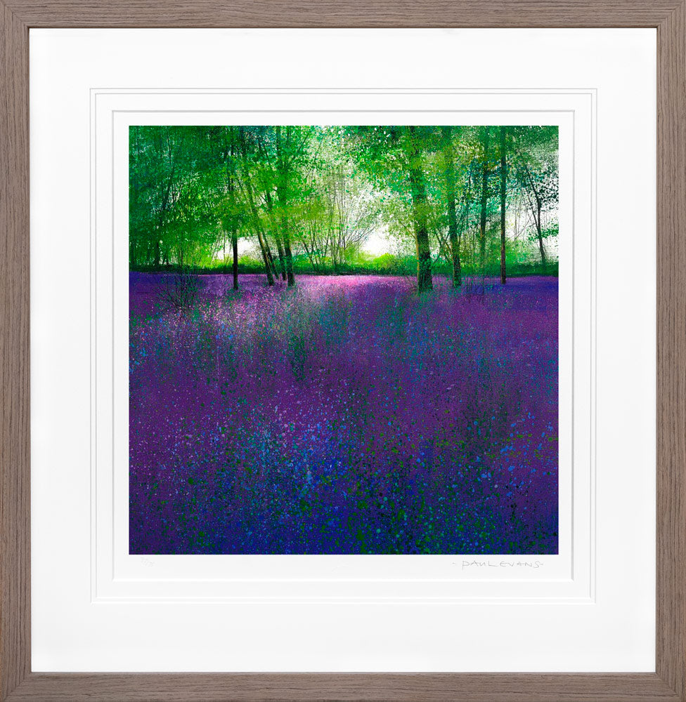 A Sea of Bluebells Paul Evans is a tranquil landscape piece, a peaceful forest in springtime sets a colourful scene of fresh green leaves, the forest floor glistens with a carpet of purple blooms capturing a calm and peaceful moment. Celebrated British landscape artist Paul Evans is known for his contemporary approach to depicting the natural scenery of the British Isles, blending modern techniques with a deep appreciation for nature’s timeless beauty.