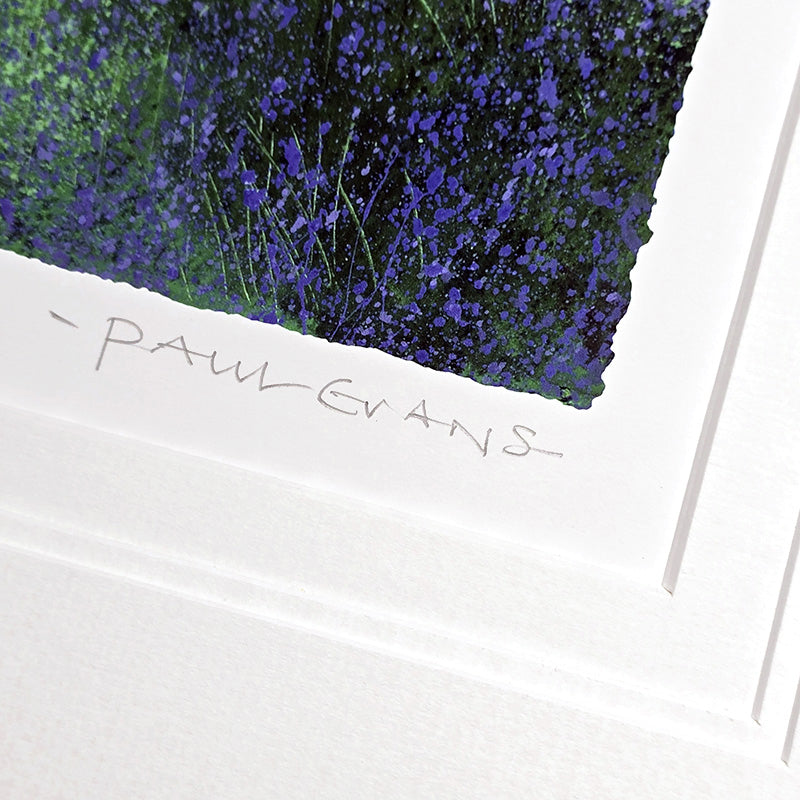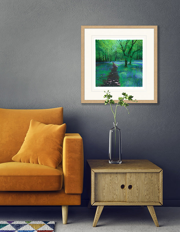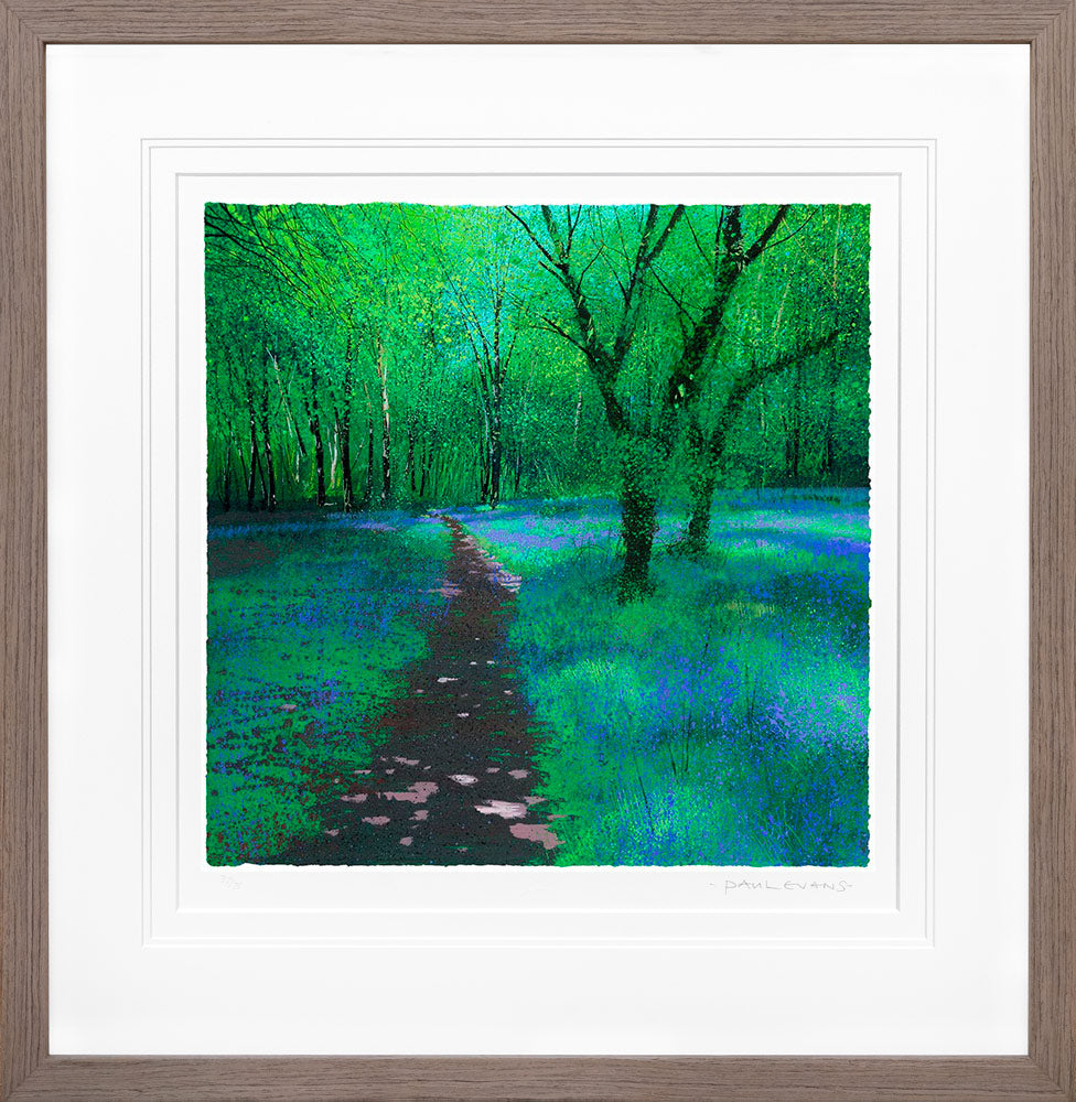 Walking Through the Wood by Paul Evans is a vibrant artwork by contemporary landscape artist Paul Evans. This striking piece captures a serene woodland path bathed in lush greens and vivid blue-violet tones, evoking the quiet magic of a forest carpeted with wildflowers. Celebrated British landscape artist Paul Evans is known for his contemporary approach to depicting the natural scenery of the British Isles, blending modern techniques with a deep appreciation for nature’s timeless beauty.