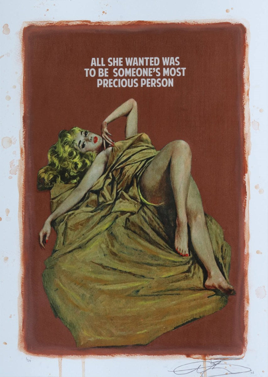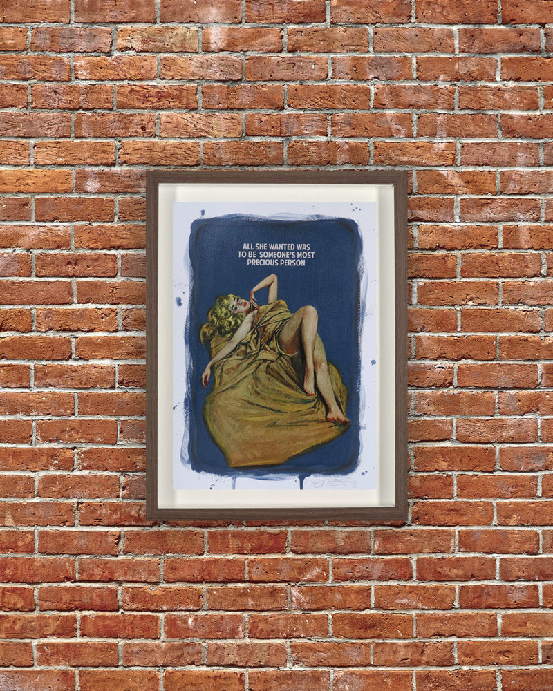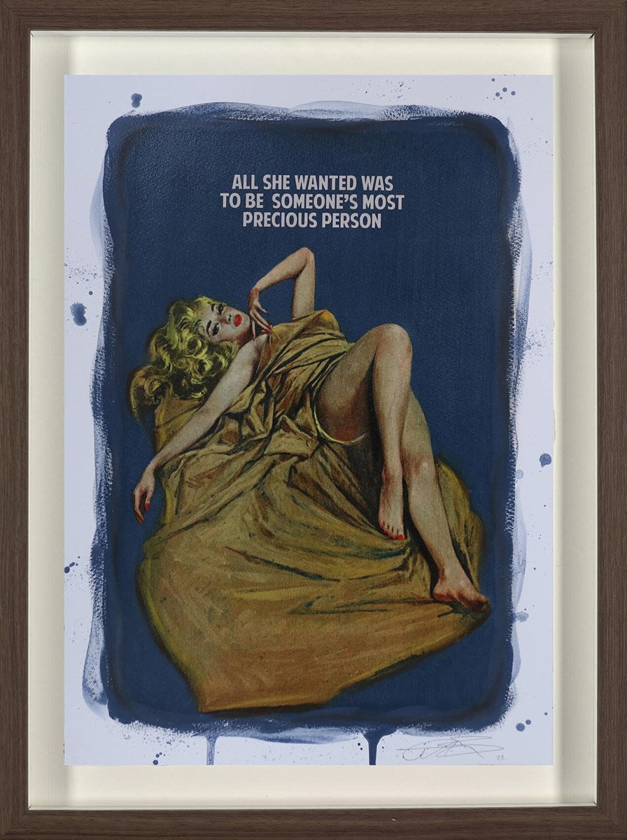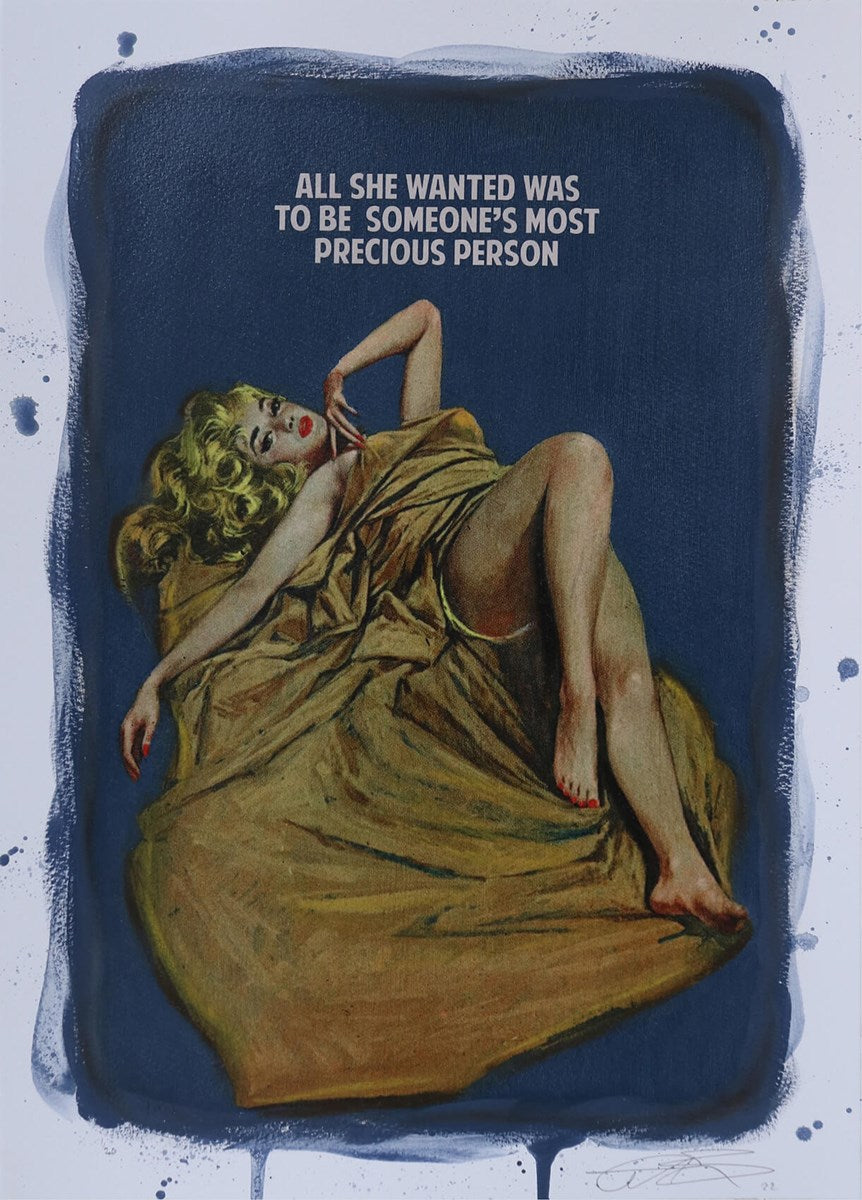 Precious Person by contemporary duo The Connor Brothers captures a beautiful blonde woman covered by a simple sheet as she poses seductively. The piece is in a poster art style, cream typeface on a blue background states "All she wanted was to be someone's most precious person". The Connor Brothers artwork is a satirical statement, styled around Penguin Classics book cover, prized by art enthusiasts and art collectors, this artwork is an ideal choice for investment artwork.