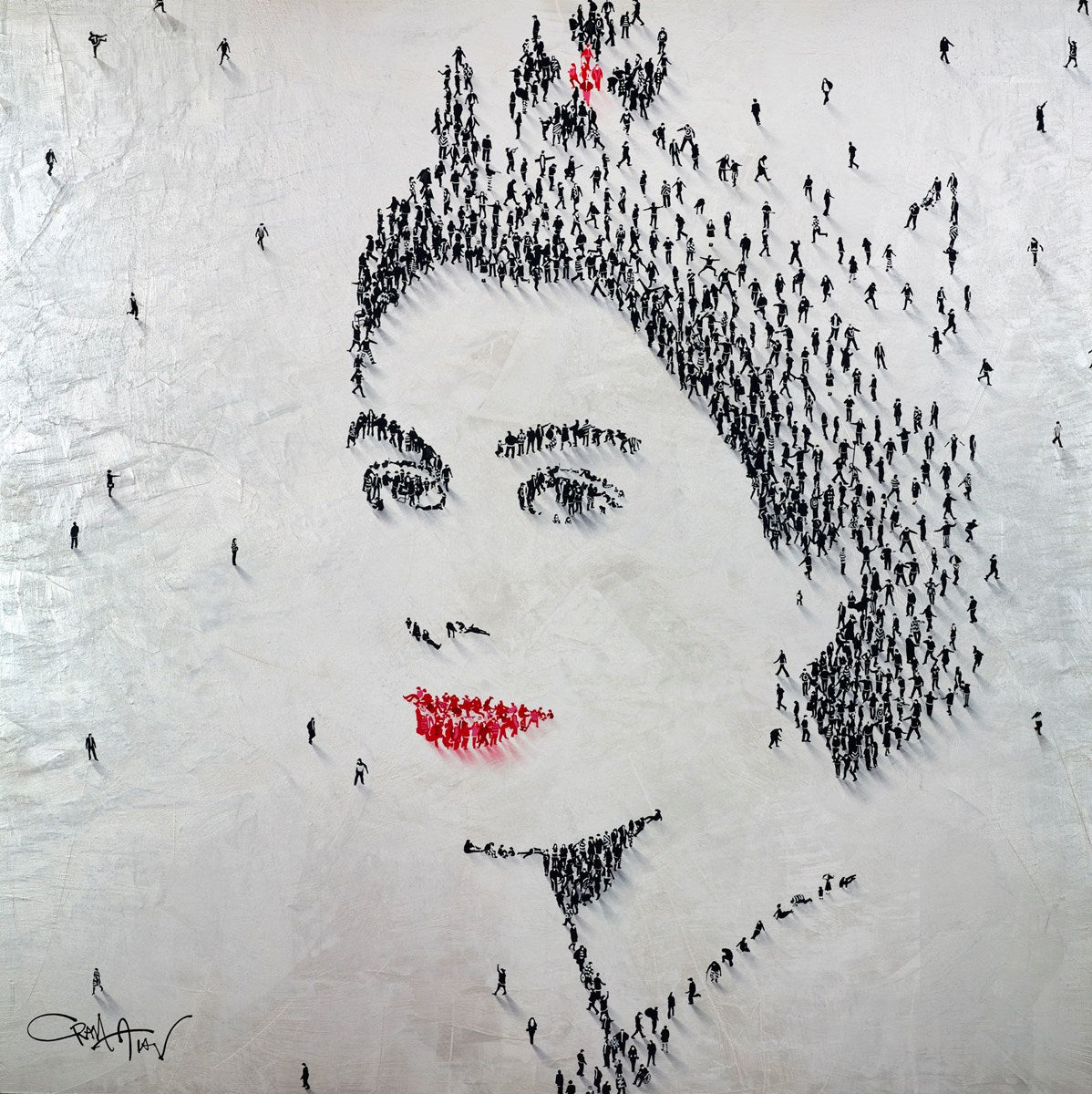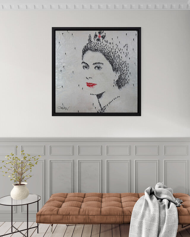 Queen Elizabeth by renowned artist Craig Alan celebrates one of the most iconic figures of our time, symbolising beauty, elegance, and grace through a stunning composition of intricate miniature figures. Each figure in the piece is unique, depicting a variety of scenarios and interactions, making this timeless artwork both detailed and immersive. Perfect for collectors of contemporary art, celebrity portraits, or limited edition mixed media art, this piece invites viewers to spend hours exploring its remarkable details.
