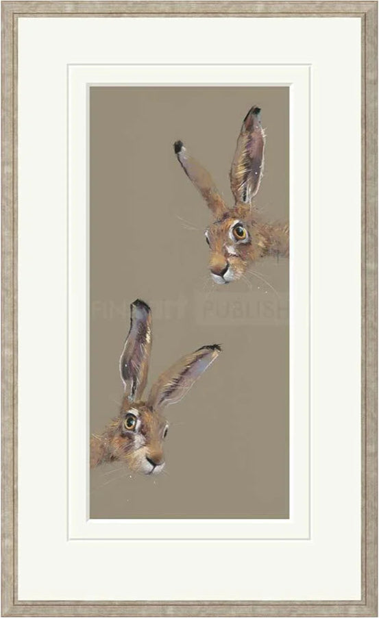Rascals by animal artist Nicky Litchfield is the portrait of two hares one atop the other as they appear on different sides of the artwork on a biscuit taupe background. Nicky Litchfield is a talented British artist creating works of art using animals as her subject matter. Her work is characterised by coloured backgrounds with the animal often placed off centre which adds to the character & personality of the art.