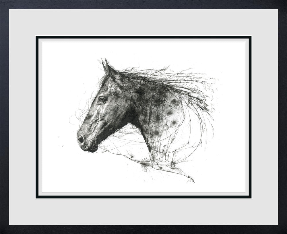 Natural Grace is a beautifully expressive equine study by renowned British artist Scott Tetlow, showcasing his signature calligraphic style. Created with dynamic, flowing lines and subtle tonal shading, the artwork captures the gentle strength and quiet poise of a horse in profile. Tetlow’s distinctive technique, influenced by his training in traditional calligraphy, brings a sense of movement and immediacy to the piece. Fine, gestural marks build into areas of detail, giving the horse both structure and spirit while maintaining an elegant, sketch-like freedom.
