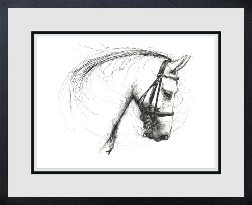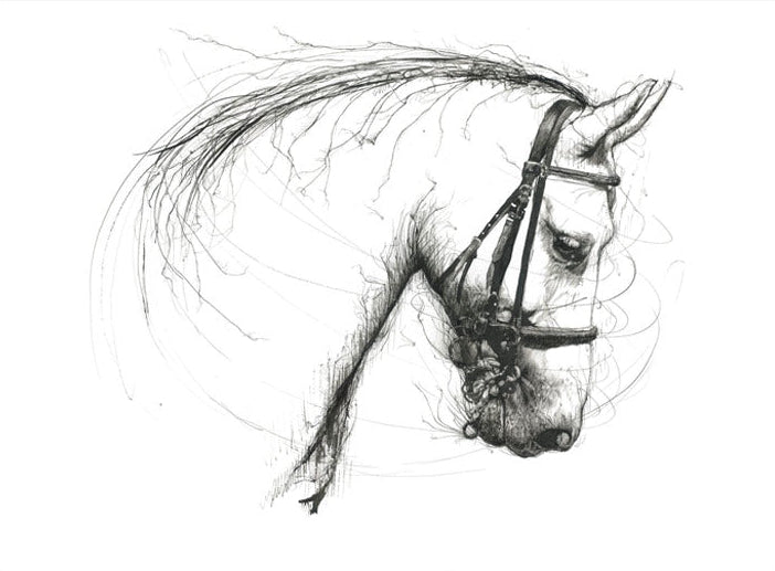 Quiet Power is a beautifully expressive equine study by renowned British artist Scott Tetlow, showcasing his signature calligraphic style. Created with dynamic, flowing lines and subtle tonal shading, the artwork captures the gentle strength and quiet poise of a horse in profile. Tetlow’s distinctive technique, influenced by his training in traditional calligraphy, brings a sense of movement and immediacy to the piece. Fine, gestural marks build into areas of detail, giving the horse both structure and spirit while maintaining an elegant, sketch-like freedom.